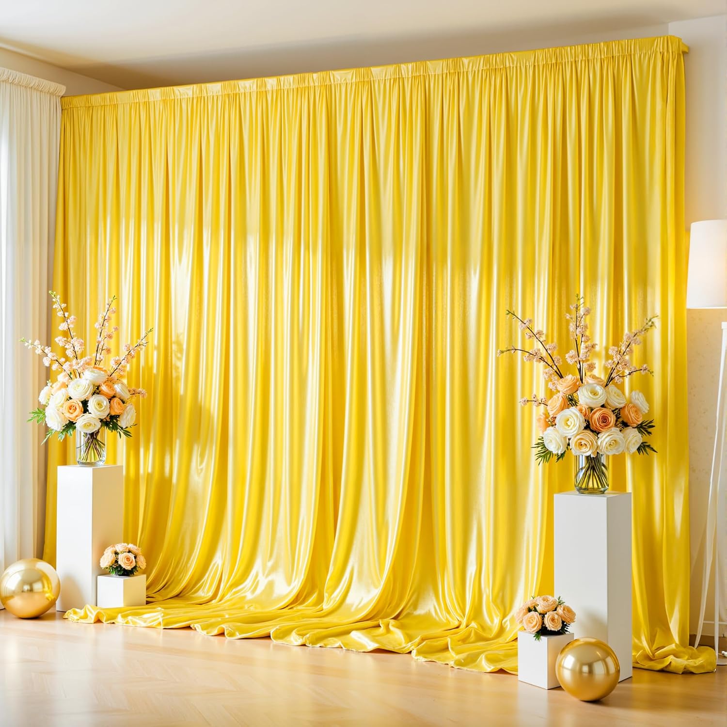 - 【Easy Use & Care】Yellow photo backdrop curtain features a convenient 4-inch circumference rod pocket at the top, allows for easy draping or straight hanging, saving your time and effort during setup.Wedding backdrop curtains are easy to care for, machine washable with a delicate cycle and mild detergent.Tumble dry on low heat and avoid bleaching to maintain their quality.