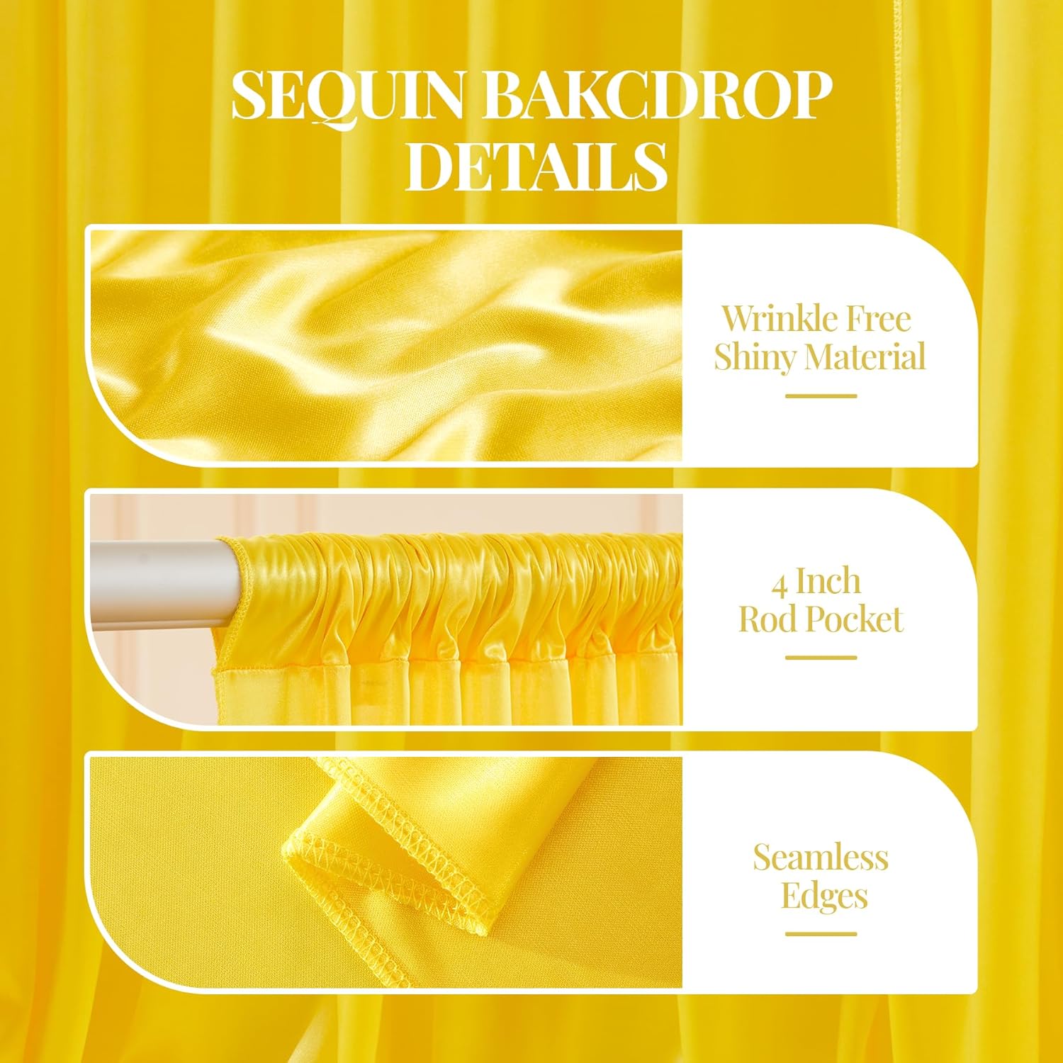 - 【Stunning Yellow Satin Curtains Material】Our sparkly backdrop curtains panels are super shiny and catch the light beautifully. But the product name there are no actual sequins on these curtain panels, the backdrop drapes is a really soft satin fabric with glitter/sparkles that gives it a nice texture. They are wrinkle free, and nothing will fall off of it. It's perfect for the backdrop for any party and they will be able to elevate the look of your decoration.