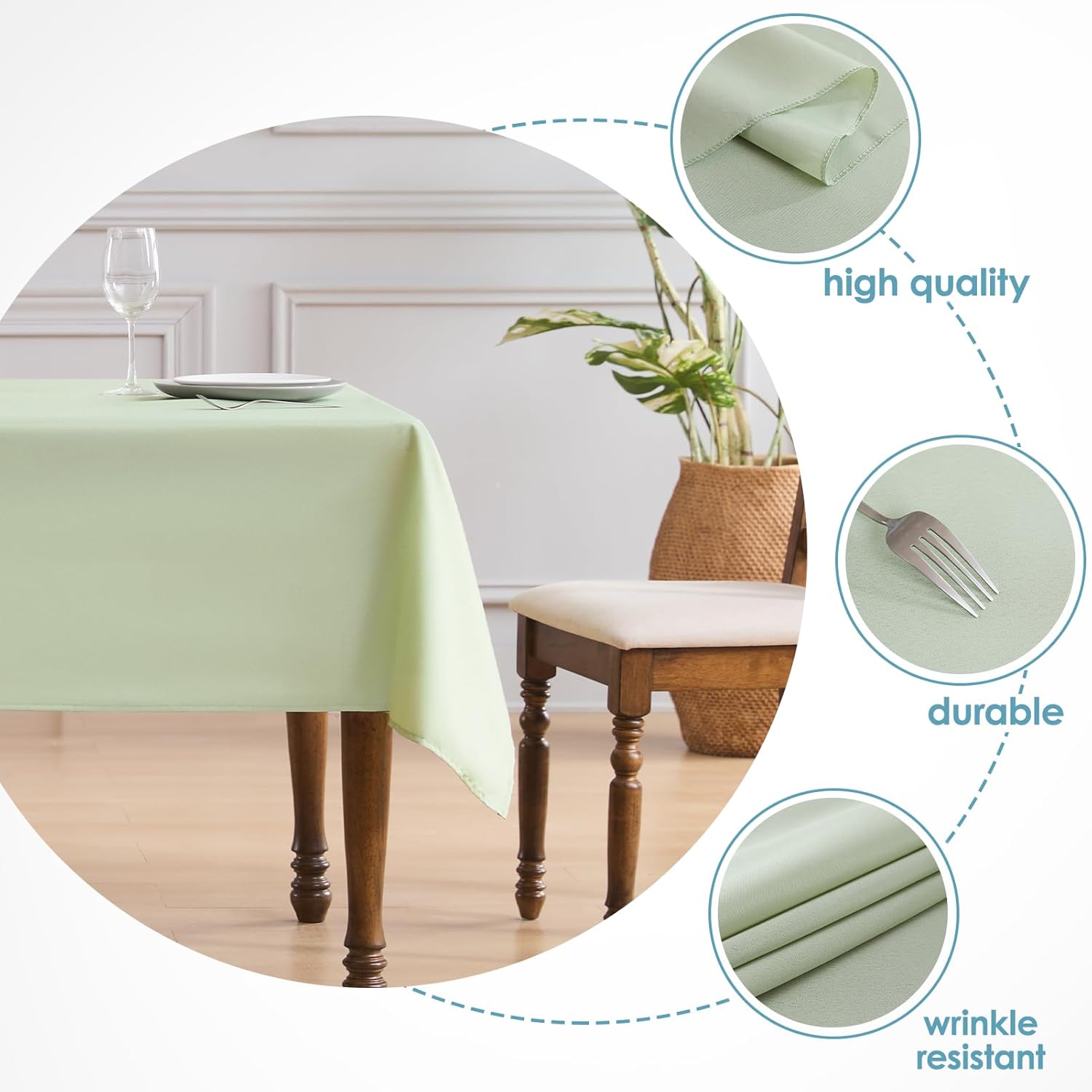 - Durable and Easy to Care: High quality polyester material makes the sagegreen tablecloth is durable, stains will not invade, and does not deform or shrink, while eliminating the problem of hand washing, machine wash and dry in cold water