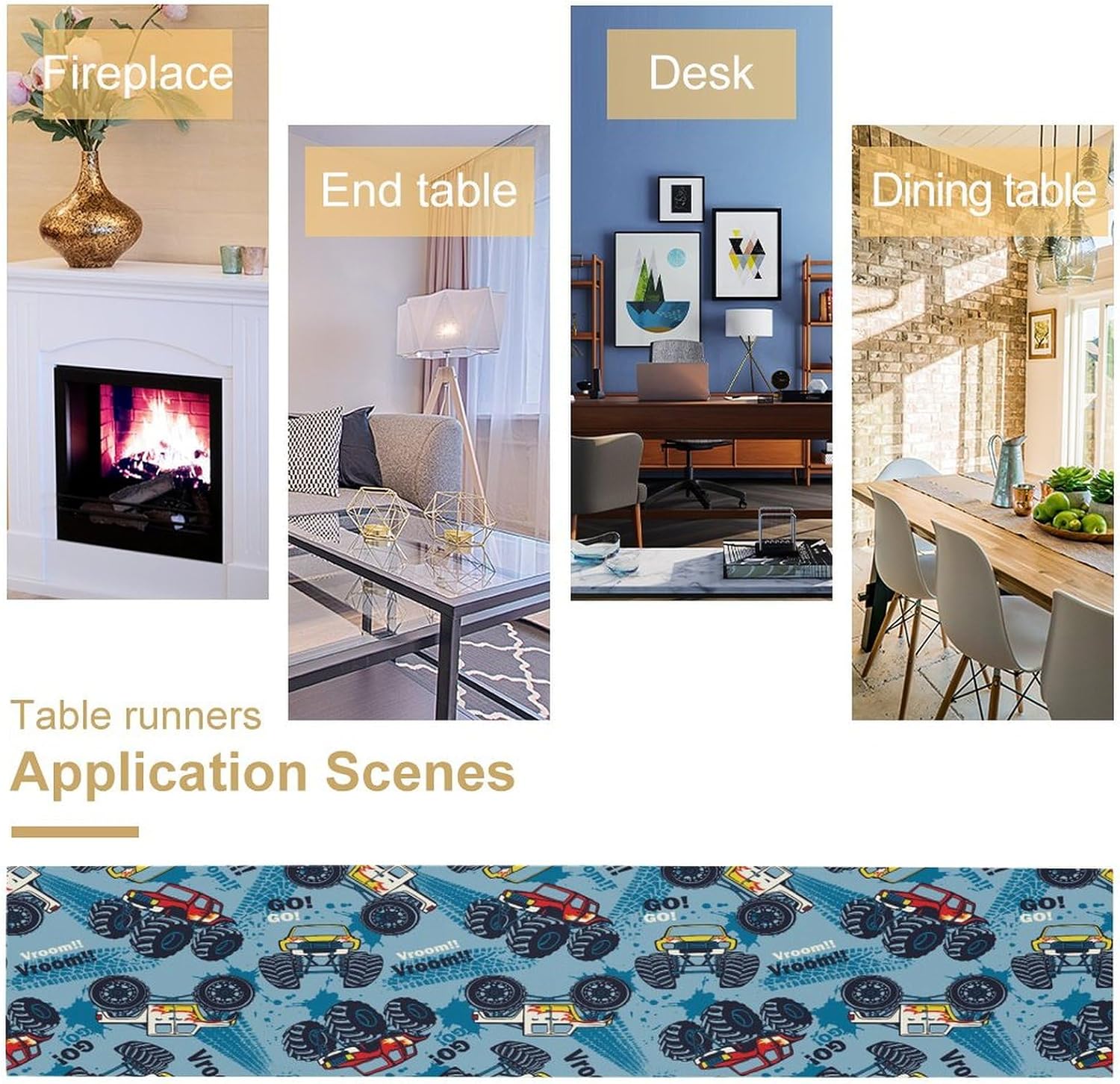 Monster Truck Table Runner,for Kids Boys Cool Colorful Cartoon Blue Cars Pattern Print Tablecloth Burlap for Hotel Indoors Outdoor Dining Room Kitchen Home Decor,W13X L36 in
