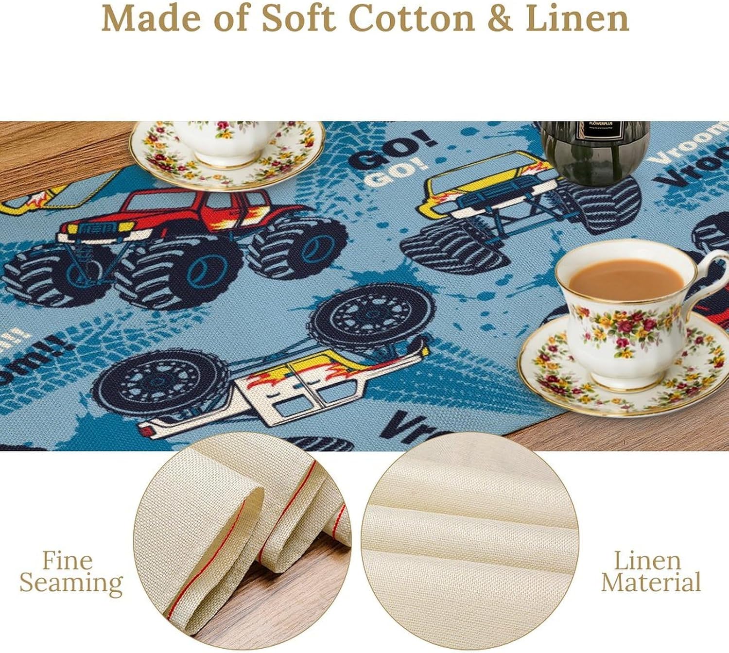 Monster Truck Table Runner,for Kids Boys Cool Colorful Cartoon Blue Cars Pattern Print Tablecloth Burlap for Hotel Indoors Outdoor Dining Room Kitchen Home Decor,W13X L90 in