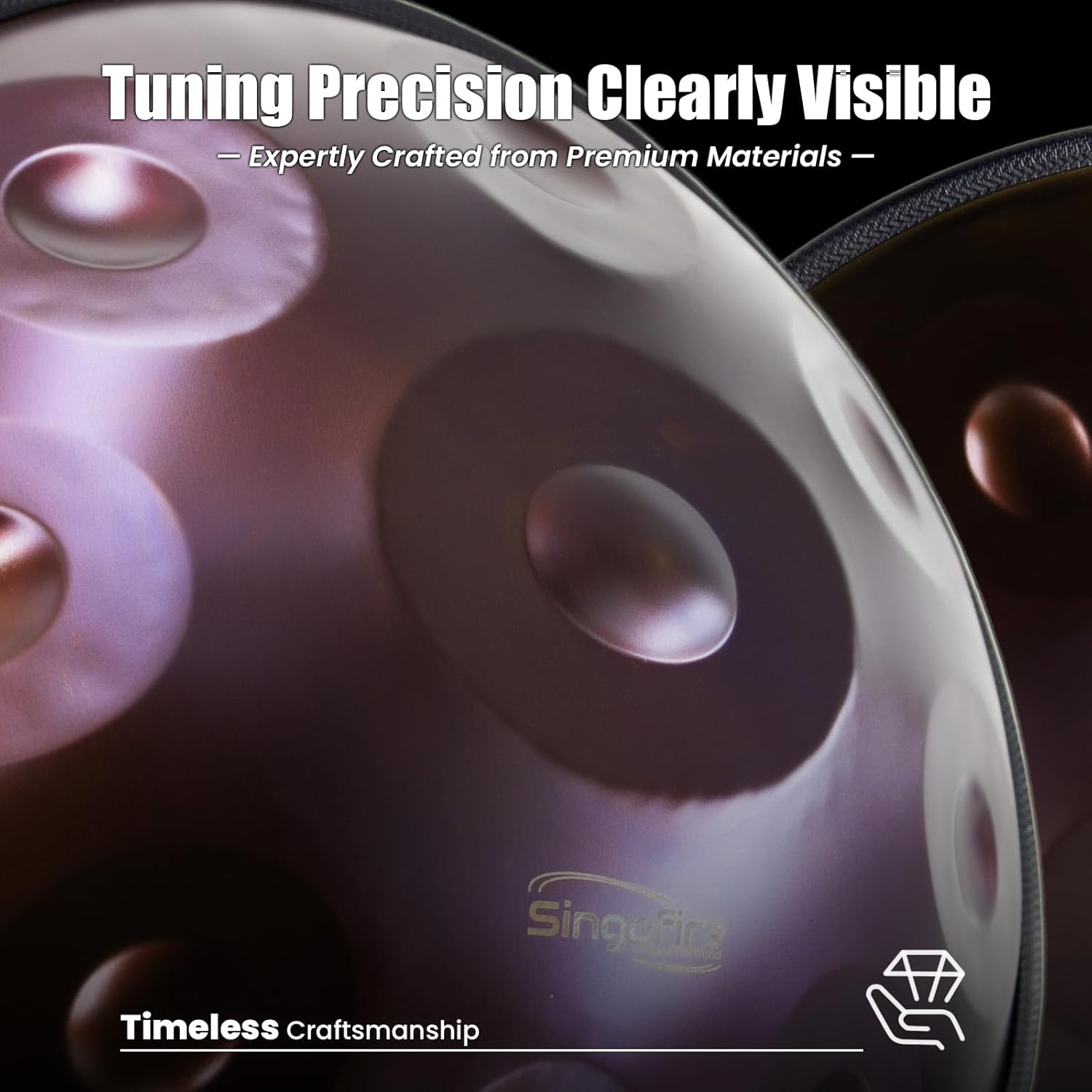 - 【Sonic Purity】SINGOFIRE handpan drums are expertly crafted with high-quality nitride steel, meticulously designed to deliver pristine 432 Hz sound frequencies. Each instrument undergoes professional tuning to ensure crystal-clear tones that resonate with the body's natural vibrations. The 432 Hz frequency is renowned for its healing and meditative properties, offering a unique sonic experience that purifies the listener's soul