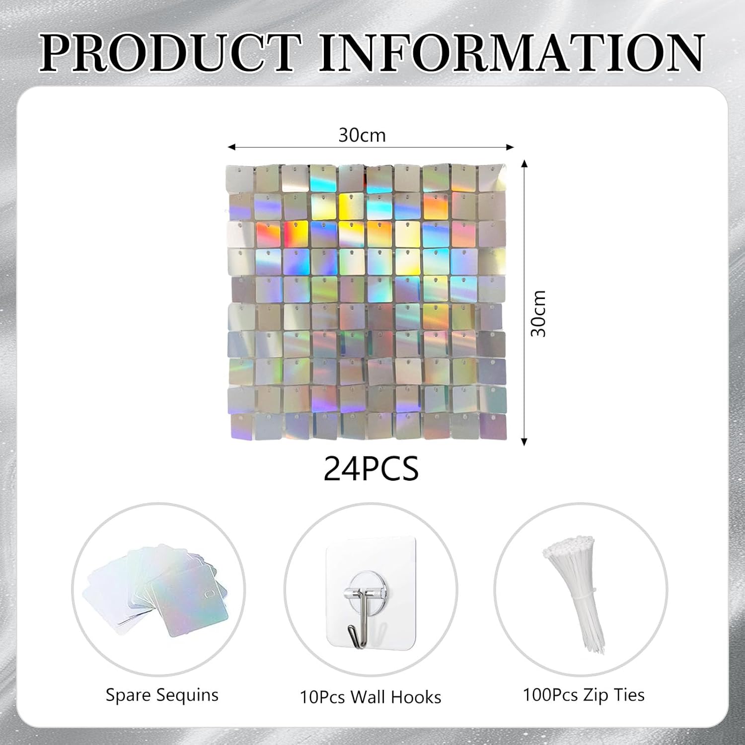 - 【Package Includes】Each box includes 24 colorful sequin wall panels (12"x 12" each). We provide enough zip ties (100 pcs), a pack of spare sequins, and wall hooks (10 pcs) to support the weight of the wind panel, as well as an installation manual. 24pcs can cover 6x4ft place. More boxs will cover a larger area and have a fuller look.