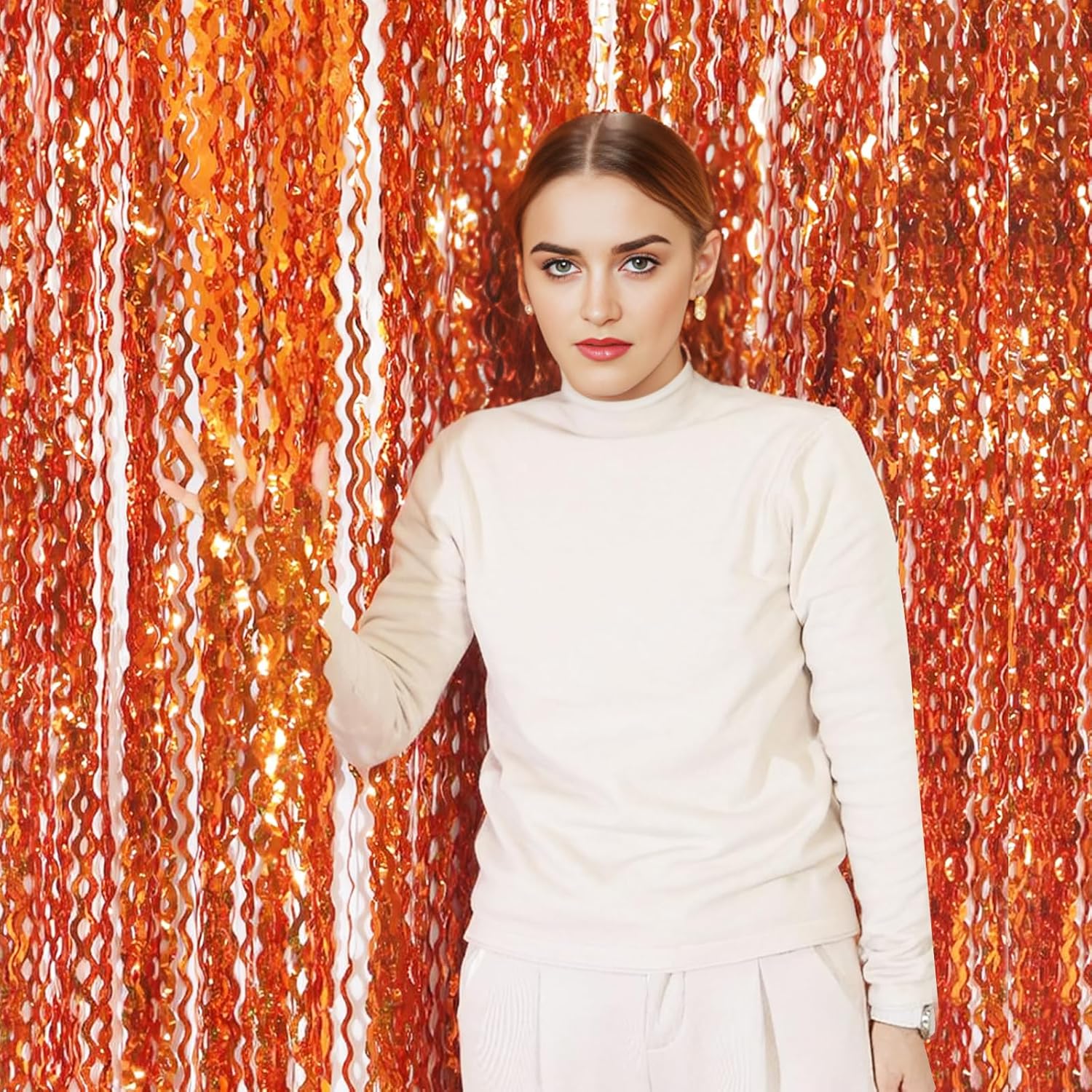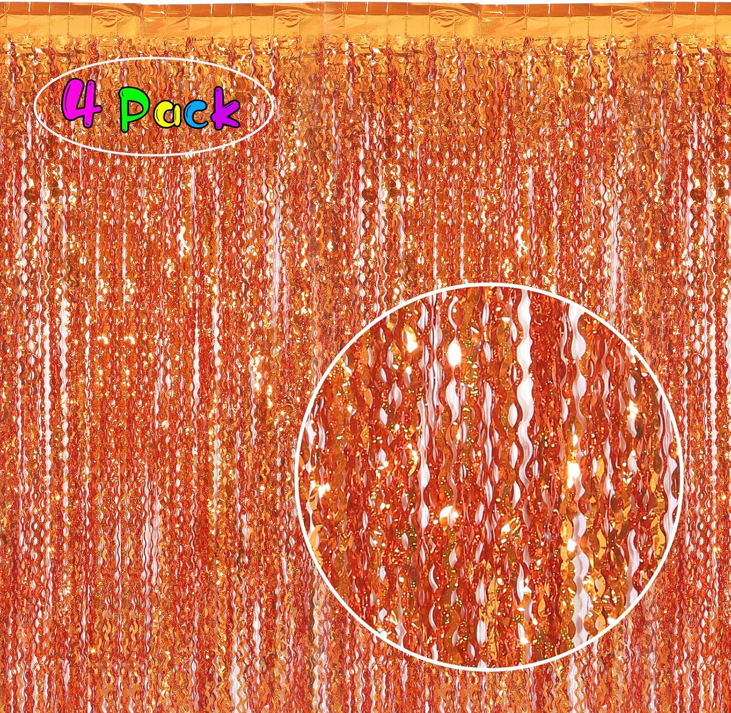 - Package Contents: 4 pack orange wavy foil fringe curtains,each curtain is 3.3ft x6.6ft,You can cut the sparkle metallic backdrop into the suitable length for use,Wonderful accessories for decorating doors and walls