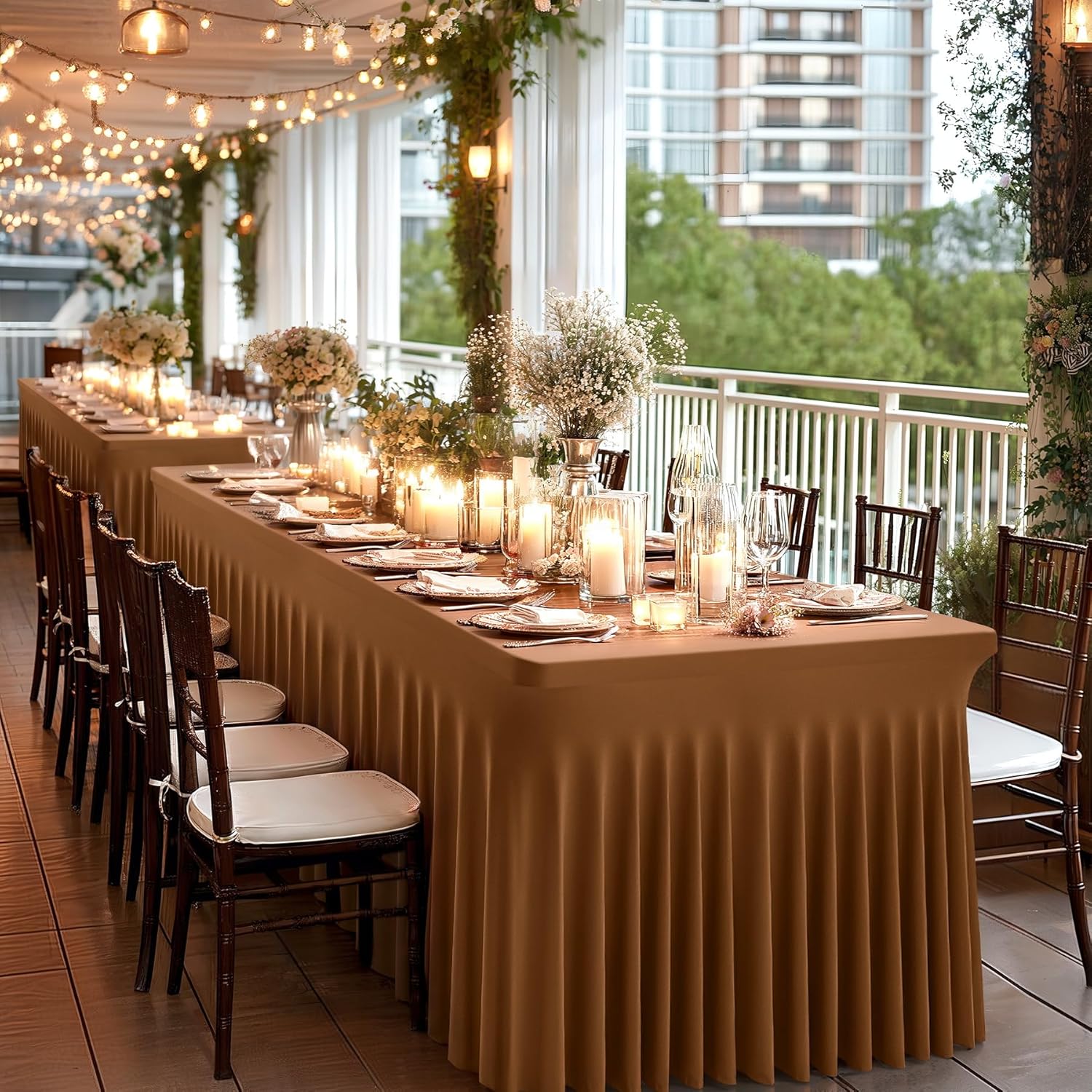 Wish Care 2 Pack Brown Spandex Table Clothes for 6 Foot Rectangle Tables, 6FT Wrinkle Free Fitted Tablecloths Ruffles Design Table Cover for Party, Banquet, Wedding and Events
