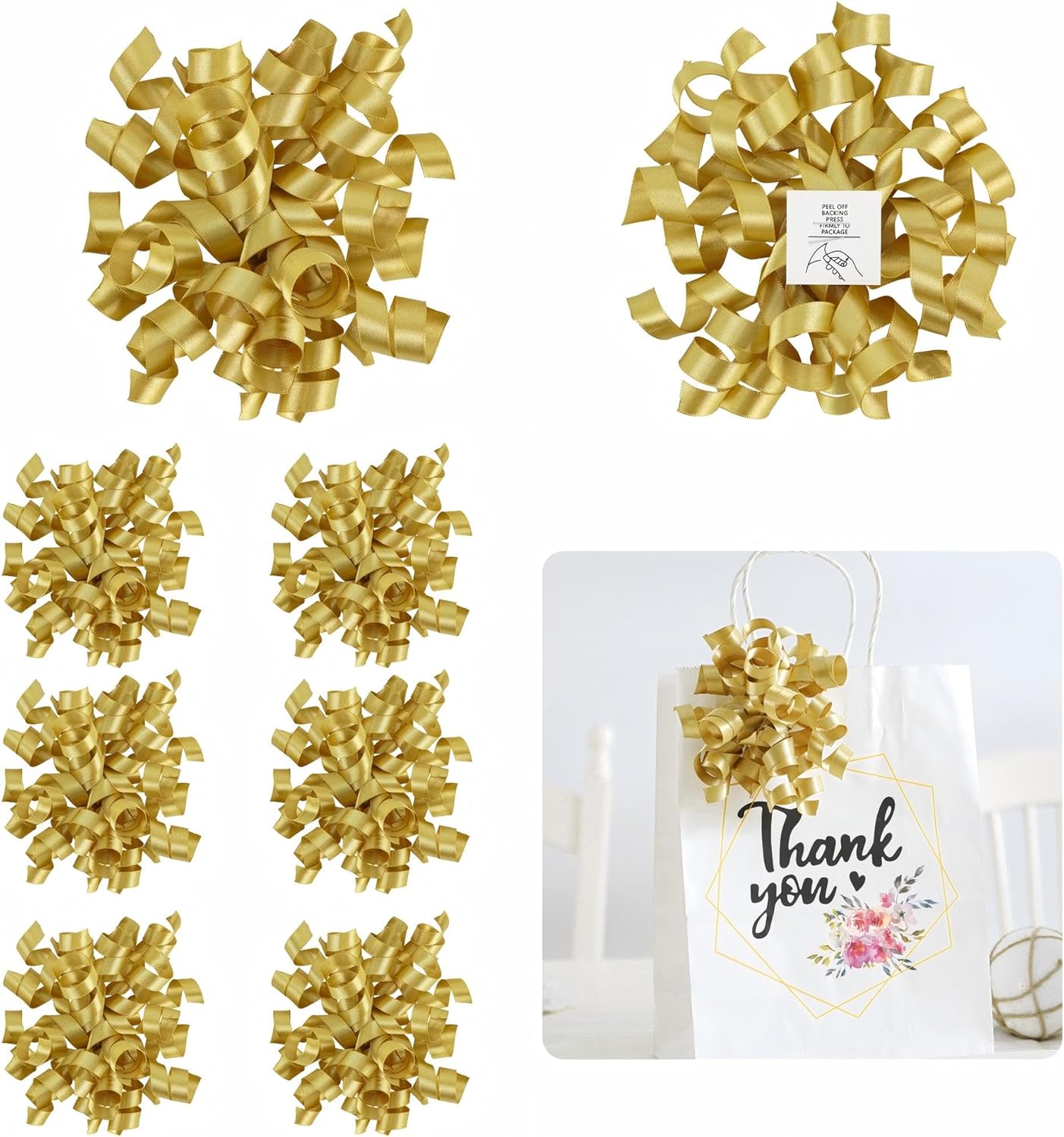 5 Inch Gold Bows Curly Ribbon Bows for Gift Wrapping, Satin Bows with Double-Sided Tape, Self Adhesive Bows for Party, Wedding, Birthday Decor, Premade Bows for Crafts, Wine Glasses-8 PCs