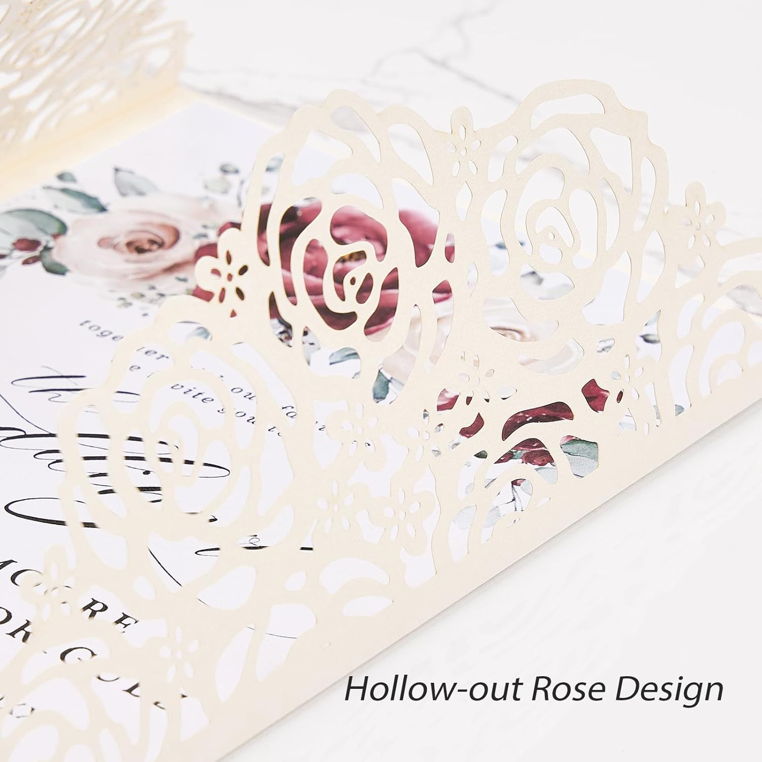 - Size: ivory laser cut invitations pocket 4.9''x7'', invitation paper 4.7''x6.9'', rsvp card 4.7''x3.4'', white envelopes 5.4''x7.7''. If you don't use our inner cards, kindly confirm the size before ordering!