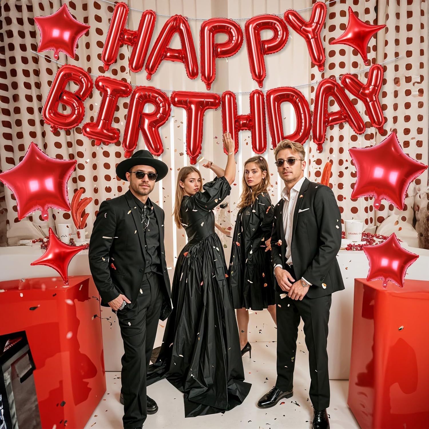 - VALUABLE PARTY DECORATION SET – Create an unforgettable birthday celebration with our Happy Birthday Balloons Banner set! Includes a 16-inch red Mylar Foil Letter Balloons set, 4 red star balloons, plus essential accessories like a ribbon, glue dots, and a straw for easy setup. Everything you need for a stylish and hassle-free party!