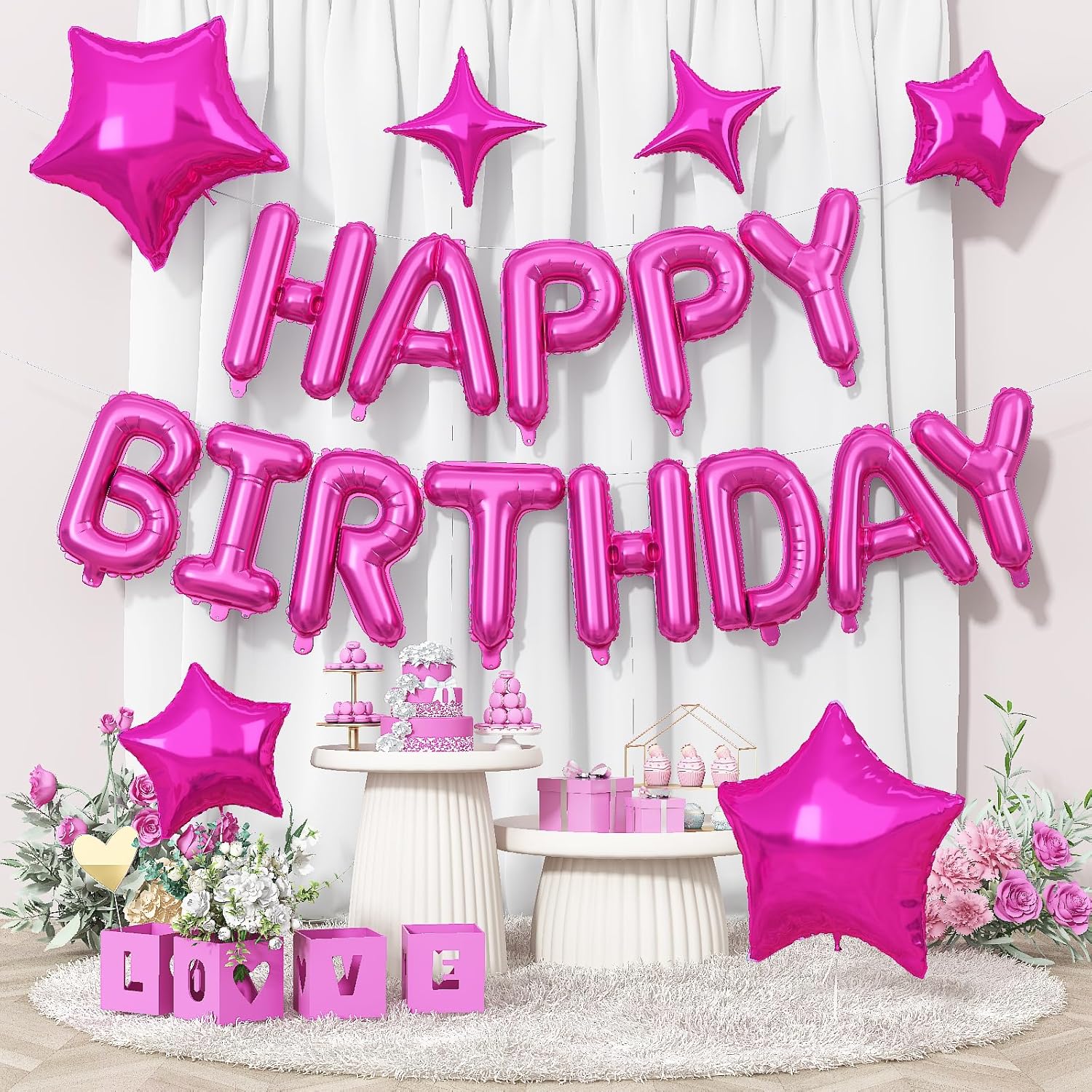 - VALUABLE PARTY DECORATION SET – Create an unforgettable birthday celebration with our Happy Birthday Balloons Banner set! Includes a 16-inch hot pink Mylar Foil Letter Balloons set, 4 hot pink star balloons, plus essential accessories like a ribbon, glue dots, and a straw for easy setup. Everything you need for a stylish and hassle-free party!