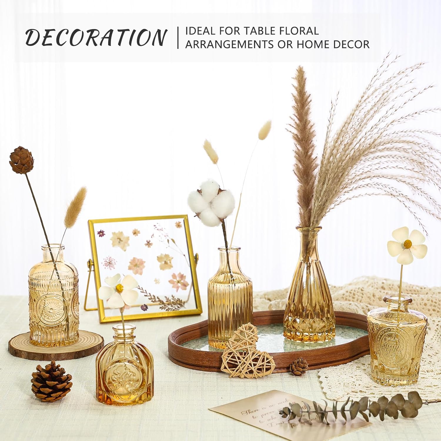 - ELEGANT VINTAGE STYLE: This set includes 5 gold amber glass bud vases, each adorned with delicate etched patterns for added charm. These flower vases boast a classy vintage design, suitable for any occasion, from casual to formal. Spruce up your window sill, dining table, or wedding reception with these beautiful vintage décor vases, creating an elegant centerpiece that will captivate all who see them.