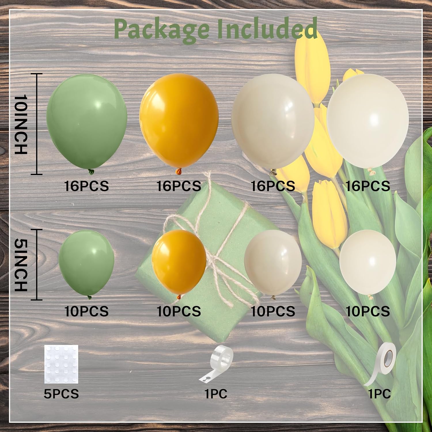 - What You Get - Sage Green Mustard Yellow Cream Sand White Balloon Garland Arch Kit, package including 64pcs 10 inches balloons(sage green*16, retro mustard lemon yellow*16, sand white*16, ivory white*16), 40pcs 5 inches balloons(sage green*10, retro lemon yellow*10, sand white*10, ivory white*10), 1 roll of 5 meters balloon strips, 1 roll of ribbon, 5pcs dot glues. Total 111 pcs, all in one package!
