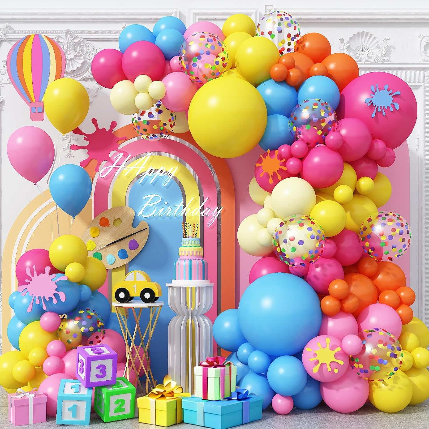 - What You Get - Rainbow Balloon Garland Arch Kit, package including 8pcs 12 inches colorful confetti balloons, 3pcs 18 inches balloons(yellow*10, light blue*1, rose red*1), 60pcs 10 inches balloons(yellow*10, pink*10, light blue*10, rose red*10, orange*10, macaron yellow*10), 48pcs 5 inches balloons(yellow*8, pink*8, light blue*8, rose red*8, orange*8, macaron yellow*8), 1 roll of 5 meters balloon strips, 1 roll of ribbon, 5pcs dot glues. Total 126 pcs, all in one package!
