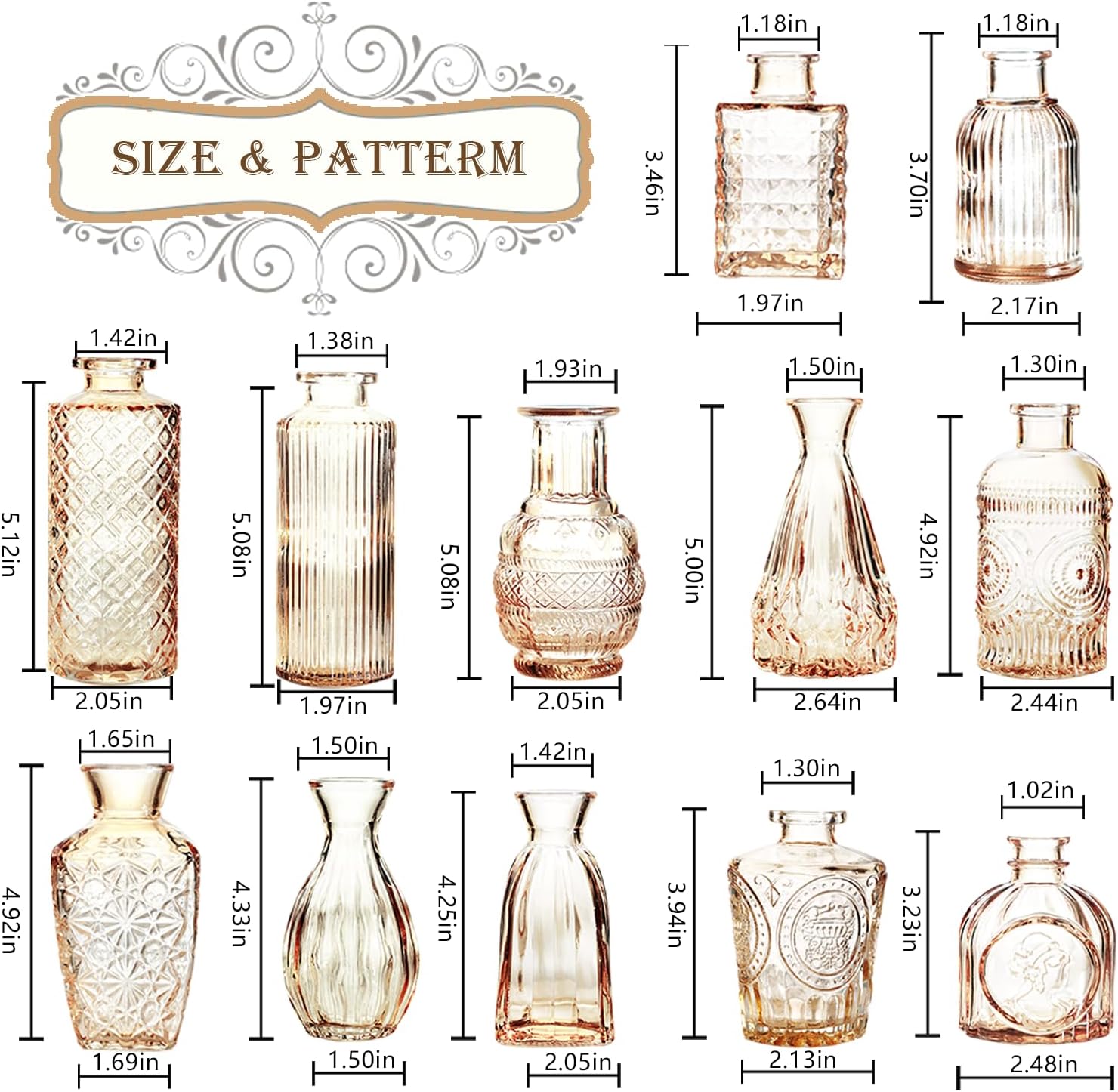 - Vintage Vase: You get 12 amber bud vases, each small glass vase is decorated with etched patterns to further enhance its attractiveness. These flower vases boast a vintage design, equally suited for elegant centerpieces and casual home decor, perfect for displaying on windowsills, dining tables, or wedding reception displays