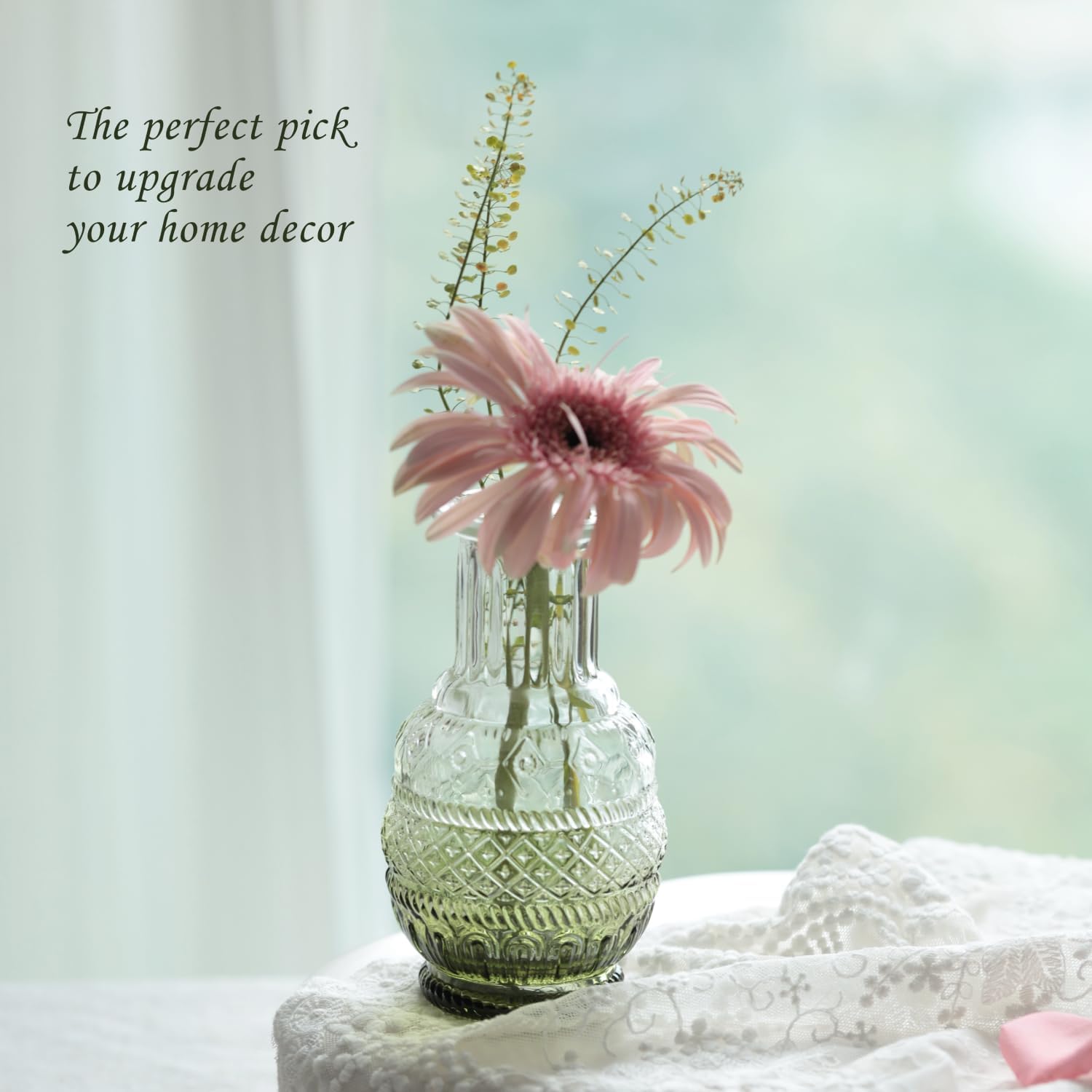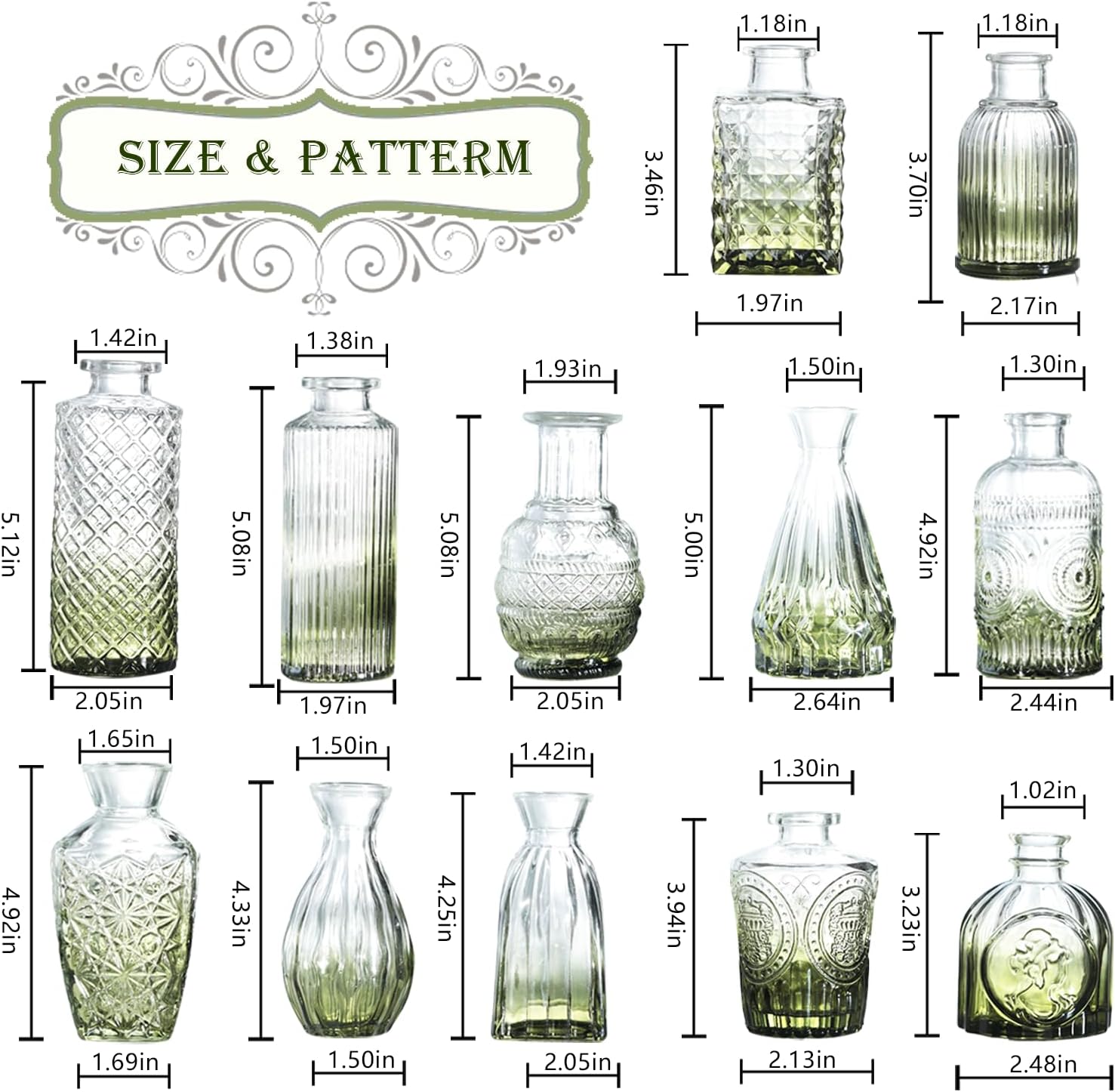 - Vintage Vase: You get 12 green bud vases, each small glass vase is decorated with etched patterns to further enhance its attractiveness. These flower vases boast a vintage design, equally suited for elegant centerpieces and casual home decor, perfect for displaying on windowsills, dining tables, or wedding reception displays