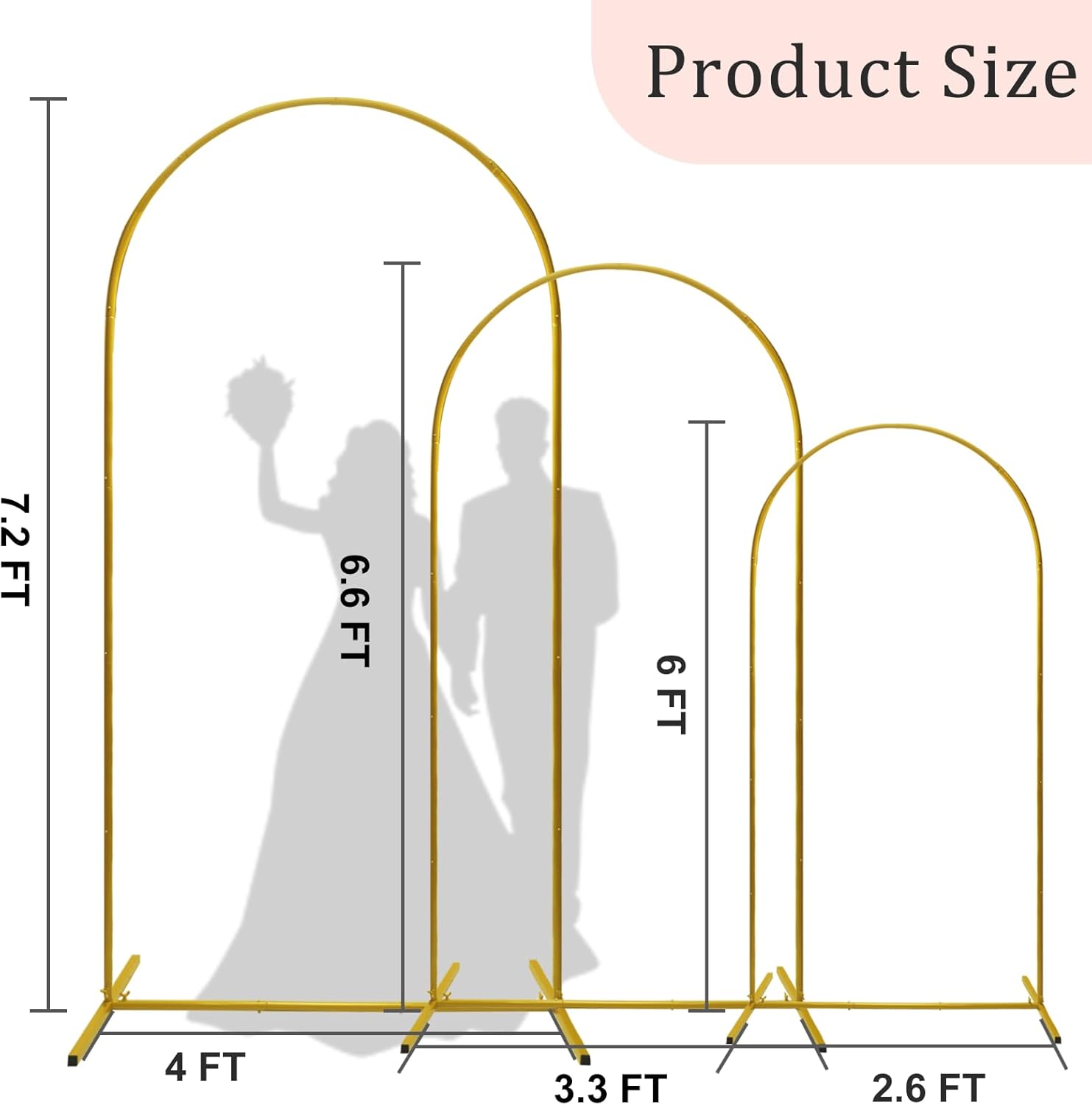 - What You Get:3 arch stands of different sizes-7.2FTx4FT, 6.6FTx3.3FT, 6FTx2.6FT. And an installation manual