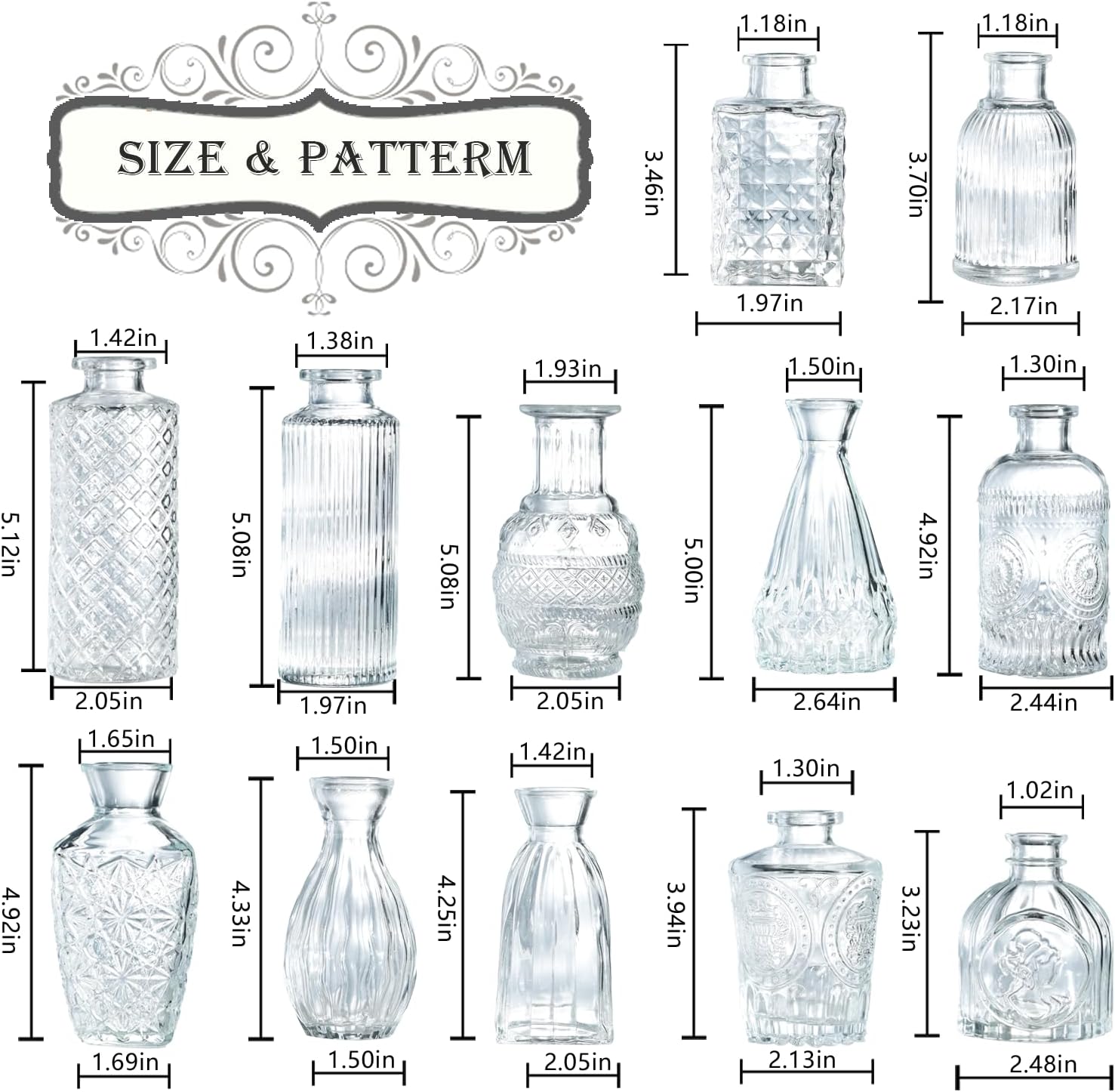 - Vintage Vase: You get 12 clear bud vases, each small glass vase is decorated with etched patterns to further enhance its attractiveness. These flower vases boast a vintage design, equally suited for elegant centerpieces and casual home decor, perfect for displaying on windowsills, dining tables, or wedding reception displays