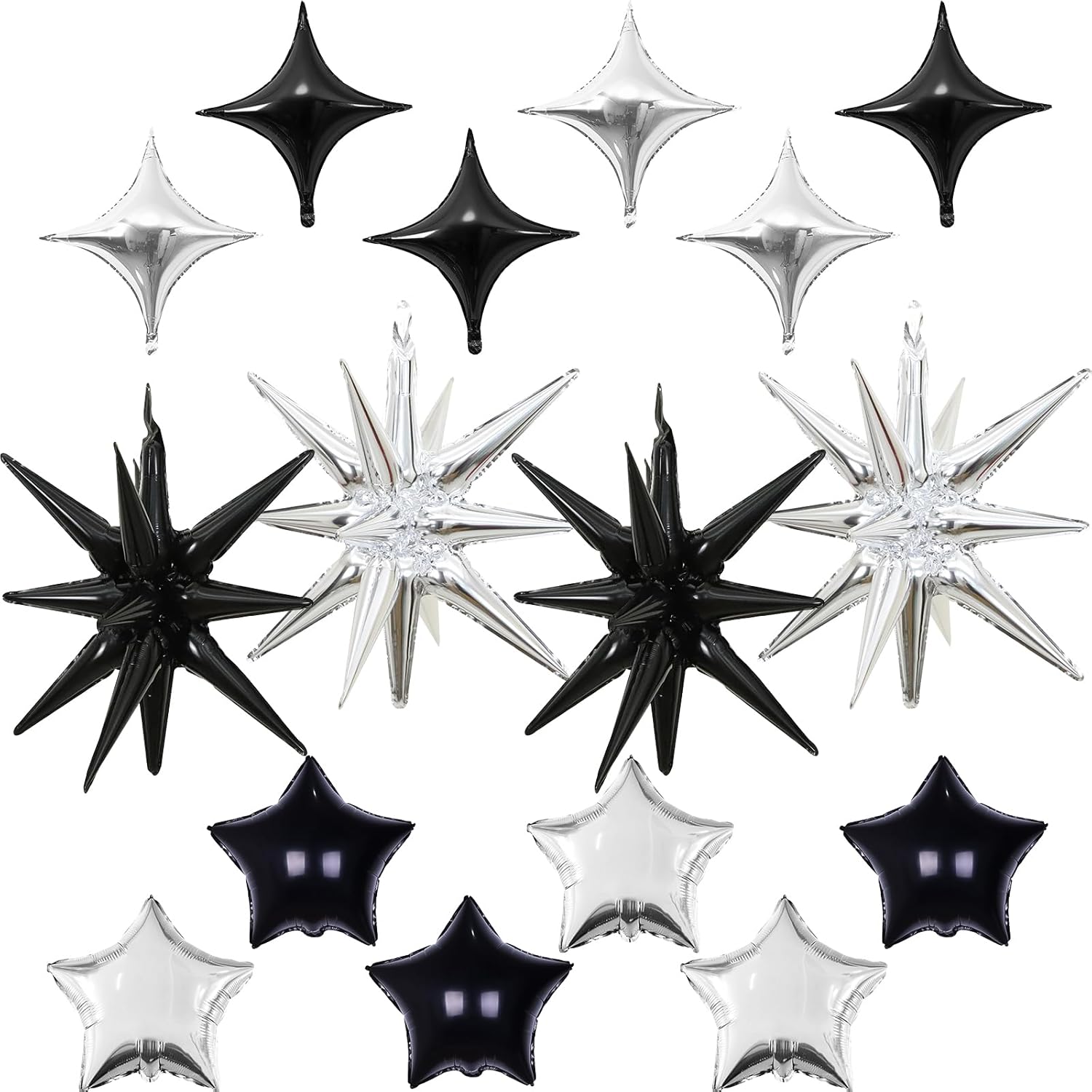 - Black Silver Balloons Set: Package includes: black, silver two-color aluminum foil star balloons (explosion stars × 4, four-pointed stars × 6, five-pointed stars × 6) , a straw and ribbon