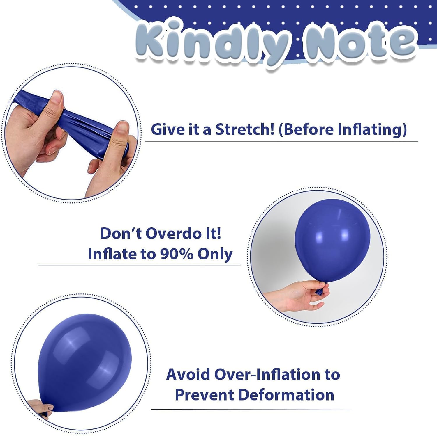 - Party-Ready Tips: Please be careful not to overfill the balloon to avoid bursting,away from sharp objects and direct sunlight to prevent damage. Please note that it is normal for 2-3 balloons out of the all to have some damage or small holes. If you have any questions or need assistance, please don't hesitate let us know.We will help you within 24 hours.