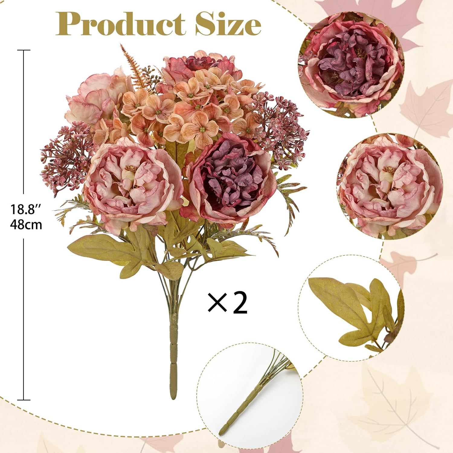 - Package Content: Include 2 bunches of fall flowers artificial for decoration, about 18.8 inches tall, each containing 4 fall pink peonies, 2 pink hydrangea, 2 plastic red hydrangea and some ferns leaves for embellishments