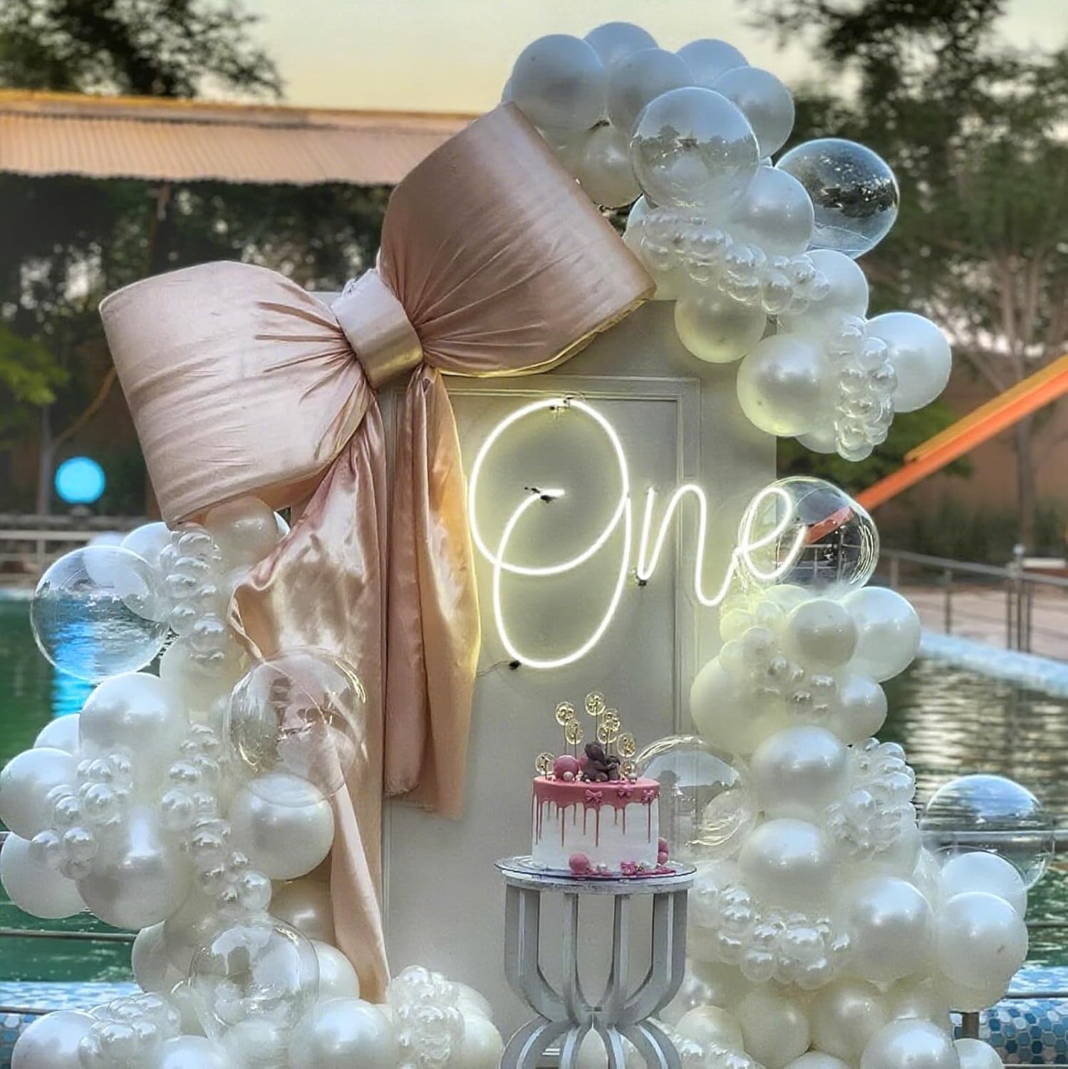 - 12 Inch Pearl White Balloon Set: 15 x pearl sand white balloons, 12 x matte clear balloons, 15 x white balloons, 8 x double balloons, and 1 x white ribbon. This stunning combination of soft white and cream balloon is ideal for creating an elegant atmosphere for weddings, baby showers, and other special celebrations.