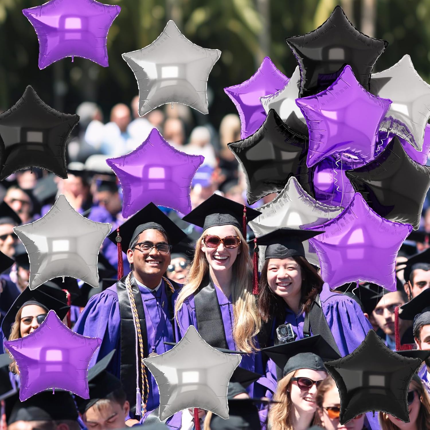 - Black Purple and Silver Stars Party Balloons: This 12Pcs purple black foil star balloons set designed with Giant 18 inch pentagram foil balloons, includes purple star mylar balloons, black star mylar balloons and silver star mylar balloons, each balloons set comes with a straw and ribbon