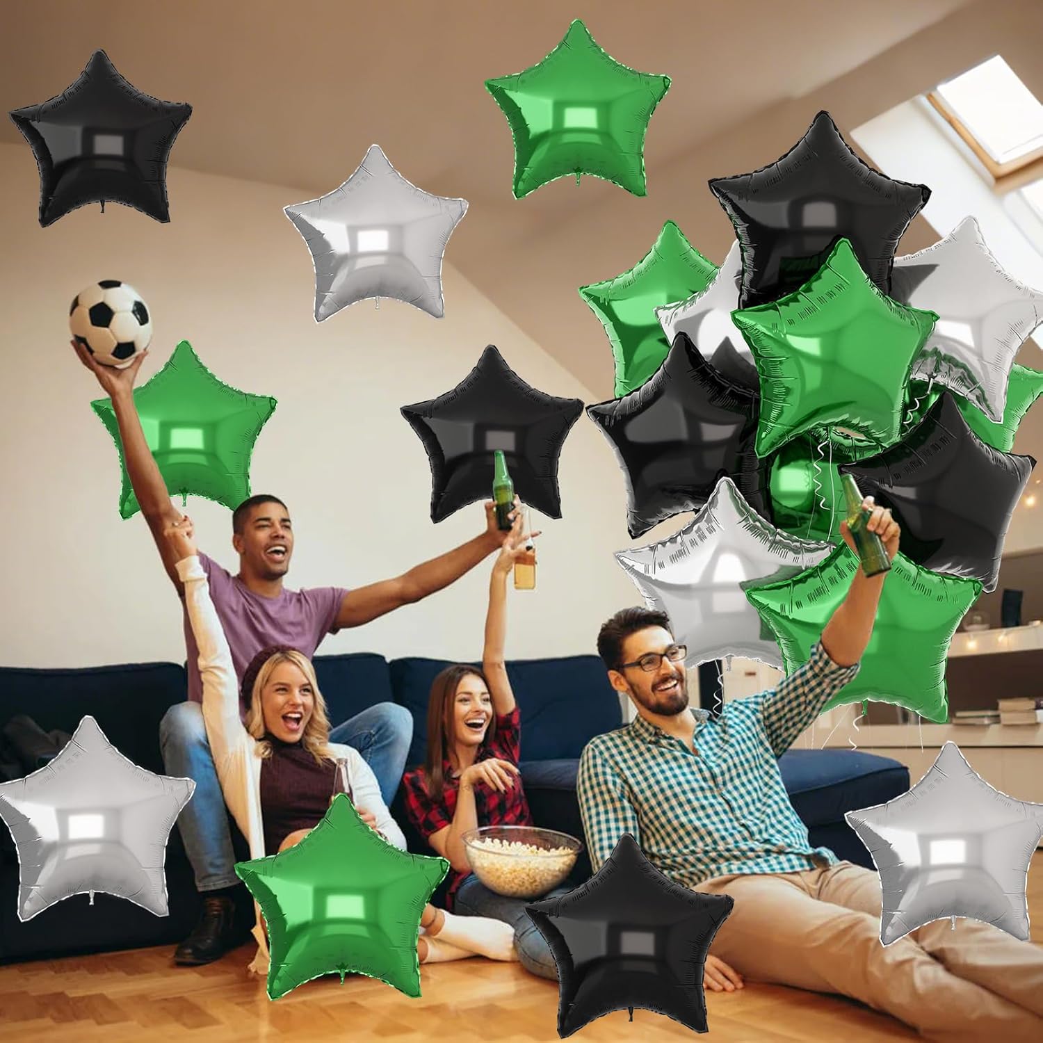- Black Green and Silver Stars Party Balloons: This 12Pcs green black foil star balloons set designed with Giant 18 inch pentagram foil balloons, includes green star mylar balloons, black star mylar balloons and silver star mylar balloons, each balloons set comes with a straw and ribbon