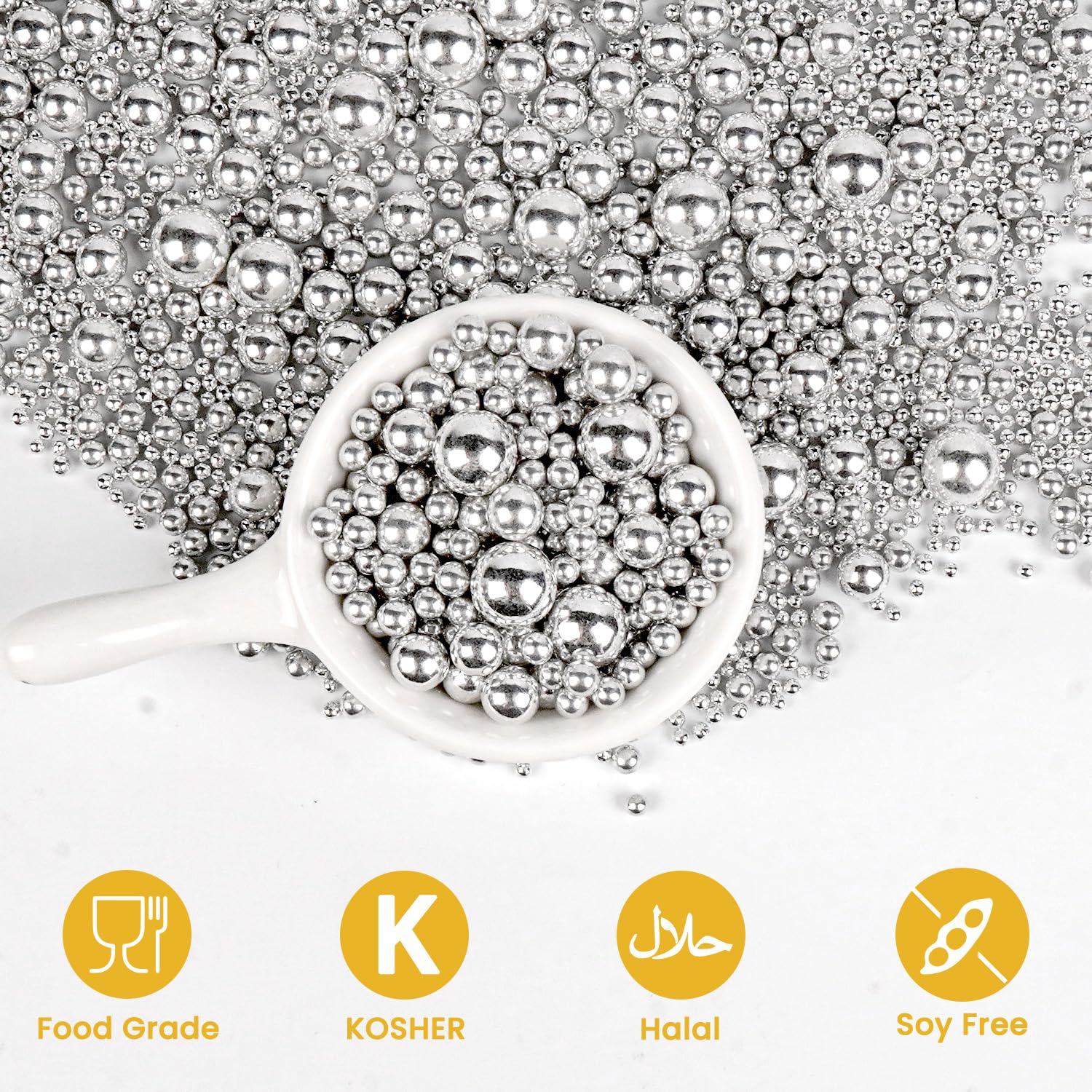 - Safe & Certified Pearls: Food-grade silver pearls sugar sprinkles made with non-GMO ingredients, 0% preservatives. Kosher/Halal-certified in facilities with no allergens (soy/nut/dairy). Tamper-proof sealed for safety.
