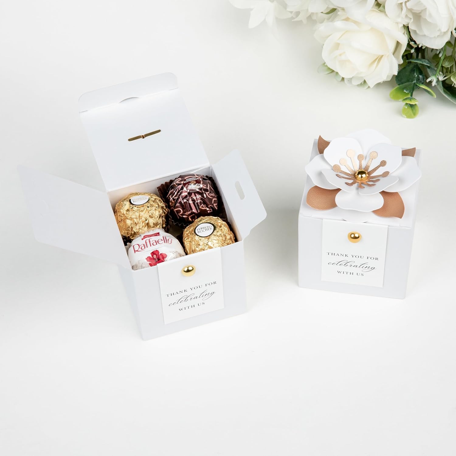FEIYI 20 PCS Candy Boxes, 3 In 1 White Favor Boxes With Floral Decor, White Thank You Tags Gift Wrapping For Wedding Birthday Baby Shower Decorations Party -2.55x2.55x2.55''