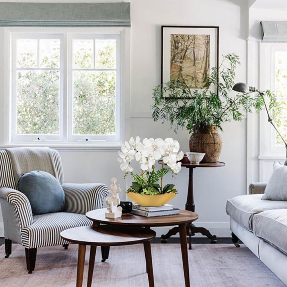 - Lifelike Appearance: Nestled in a stylish boat-shaped gold ceramic pot, this carefully curated orchid flower ensemble boasts delicate blooms that captivate the eye and infuse your surroundings with serenity. The natural-looking orchid petals and leaves and the surrounding decorative artificial plants give the orchid arrangement a more realistic appearance.