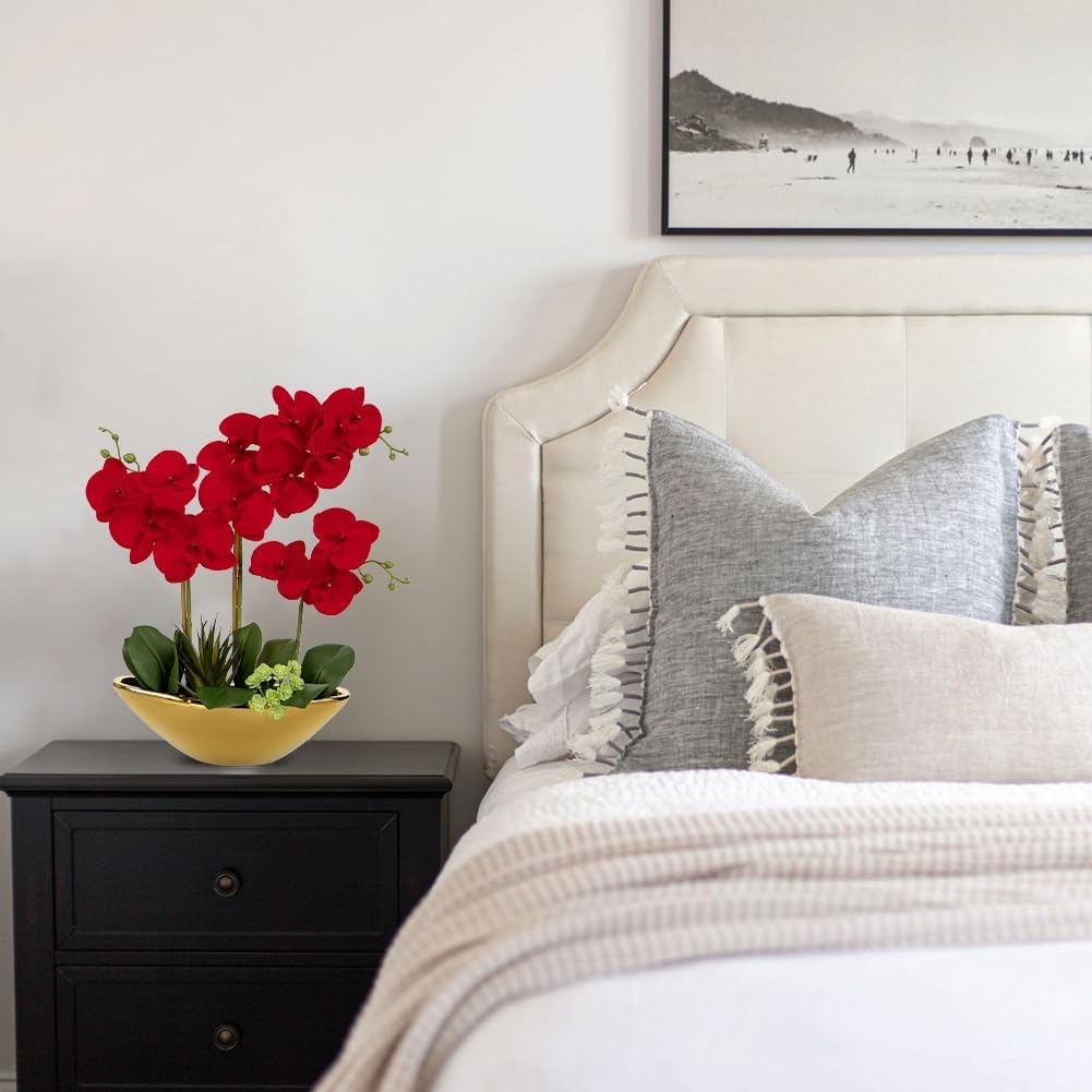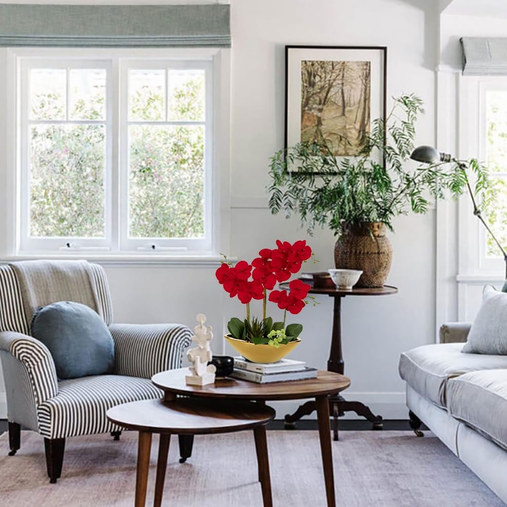 Briful Orchid Artificial Flowers 17in Red Fake Orchid Silk Flowers in Gold Ceramic Vase Faux Phalaenopsis Arrangement for Home Office Room Dining Table Centerpiece Modern Decor