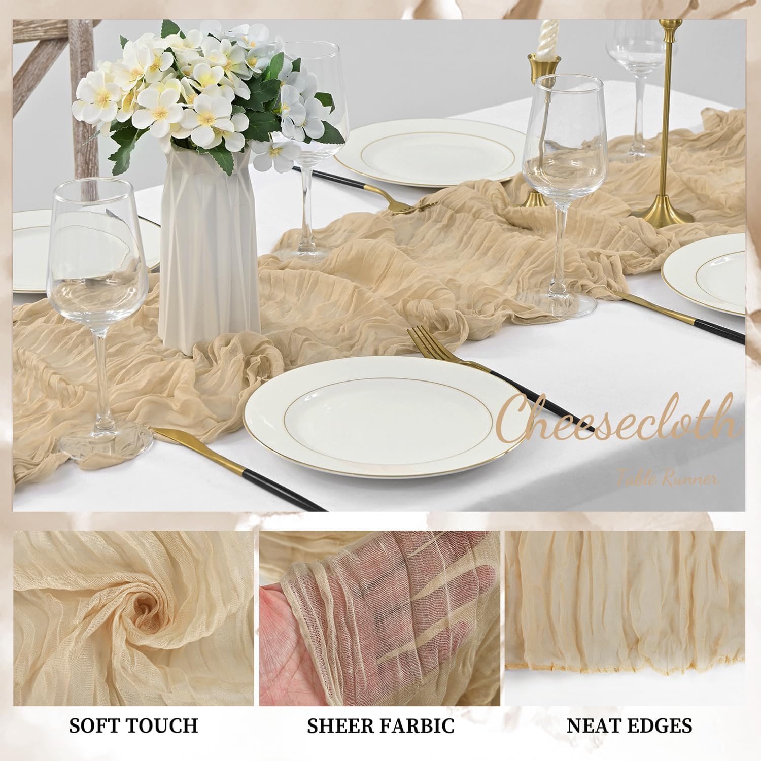 - Cheesecloth Table Runner Size: You will receive 12 sand cheesecloth tablerunner, each measuring 20 x 120 inches. The quantity is sufficient for you to decorate various romantic occasions. It can decorate most shaped tables, such as rectangular tables, round tables, and cocktail tables. It is long enough to decorate a large table and be placed perfectly and elegantly on the tabletop, adding a romantic atmosphere to your occasion.