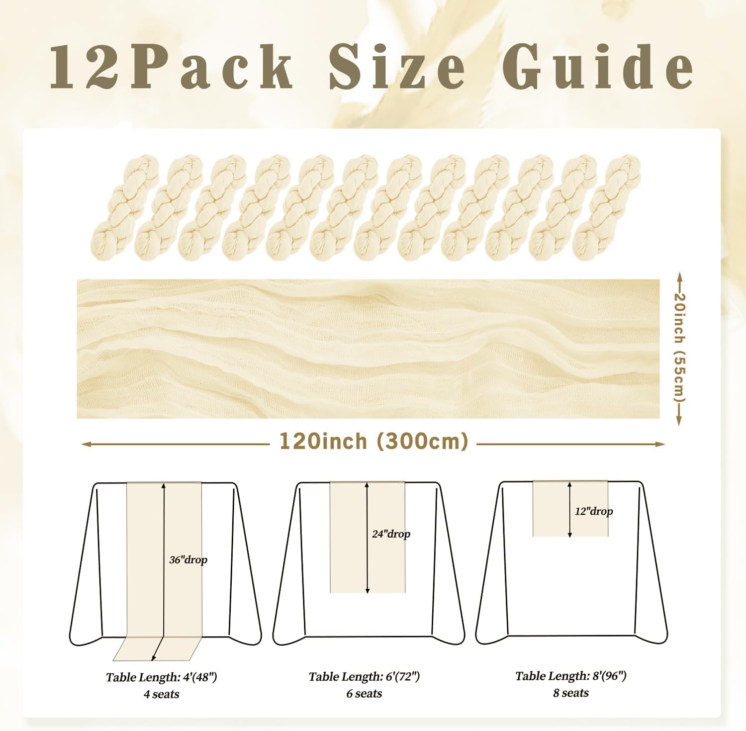 - Cheesecloth Table Runner Size: You will receive 12 beige cheesecloth tablerunner, each measuring 20 x 120 inches. The quantity is sufficient for you to decorate various romantic occasions. It can decorate most shaped tables, such as rectangular tables, round tables, and cocktail tables. It is long enough to decorate a large table and be placed perfectly and elegantly on the tabletop, adding a romantic atmosphere to your occasion.