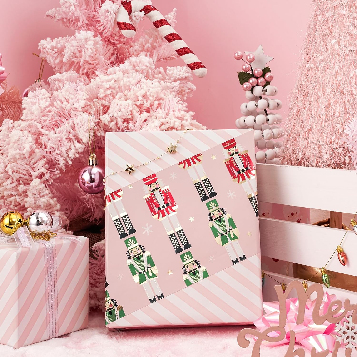 LeZakaa Christmas Pink Wrapping Paper Jumbo Roll for Kids, Pink Metallic Foil Gift Wrap Paper with Red & Green Nutcracker Soldier & Stripe Reversible Design, 30 inches x 32.8 Feet