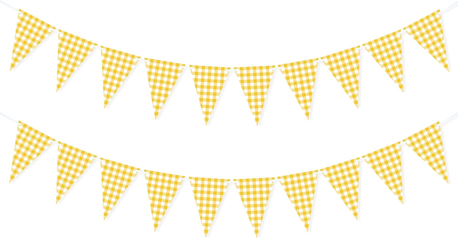 - Package includes 2pcs yellow gingham banner in classic yellow and white grid pattern, features a yellow theme to add a fun pop of color to every of your gatherings, comes pre-strung and distance adjustable that you can space them to the perfect site you like