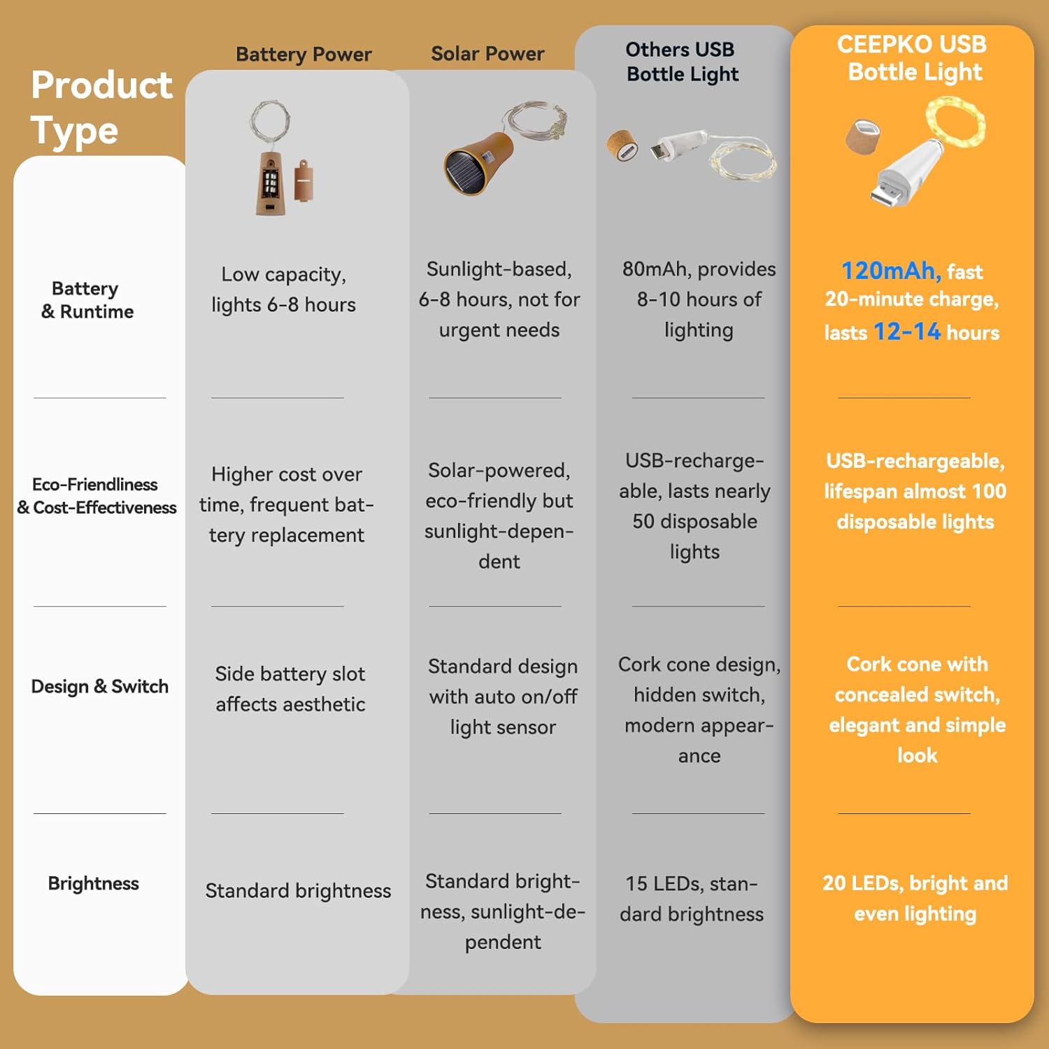 • Long Battery Life for USB Bottle Lights: Built-in 120mAh rechargeable battery provides 12–14 hours of continuous lighting on a single charge; perfect for long-lasting wine bottle fairy lights at parties, events, or home decor