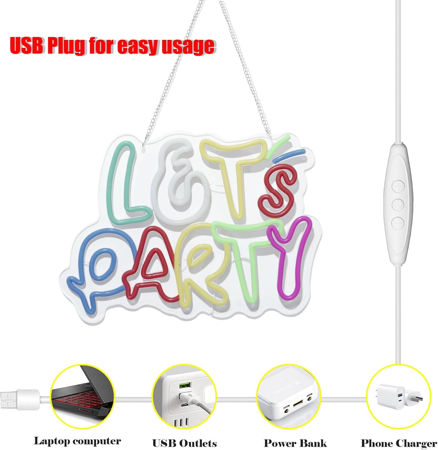 - Convenient USB Power Supply: Lets party led sign Easily plug in the neon light using any USB power source, making it versatile for indoor and outdoor use. Its user-friendly design means you can set lets party backdrop up anywhere—on a table, wall, or shelf.