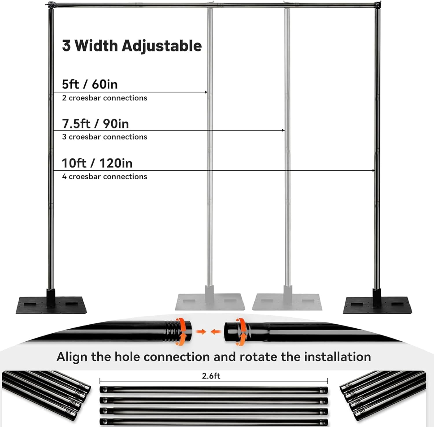 - Package Includes: The photo backdrop stand kit includes 2 bases, 4 cross bars, 8 straight pipes, 2 hex wrenches, 4 ground anchors, 1 carry bag. You can easily take the party backdrop stand anywhere you want!