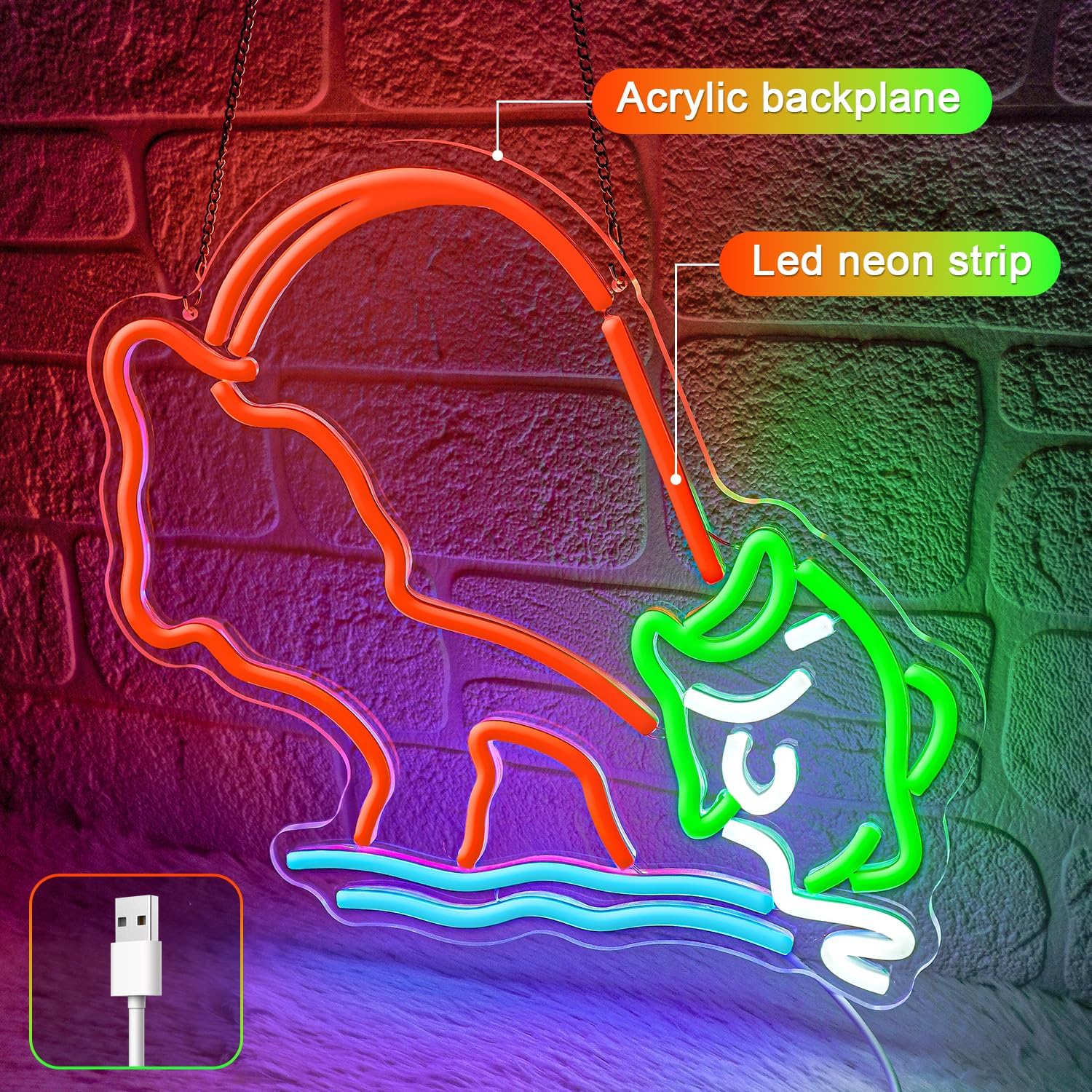 - Unique Fishing Design Neon Sign Add character to your space with this eye-catching LED neon sign featuring a fish caught on a rod – perfect for fishermen, anglers, or anyone who loves the great outdoors. The playful design turns any wall into a conversation starter.