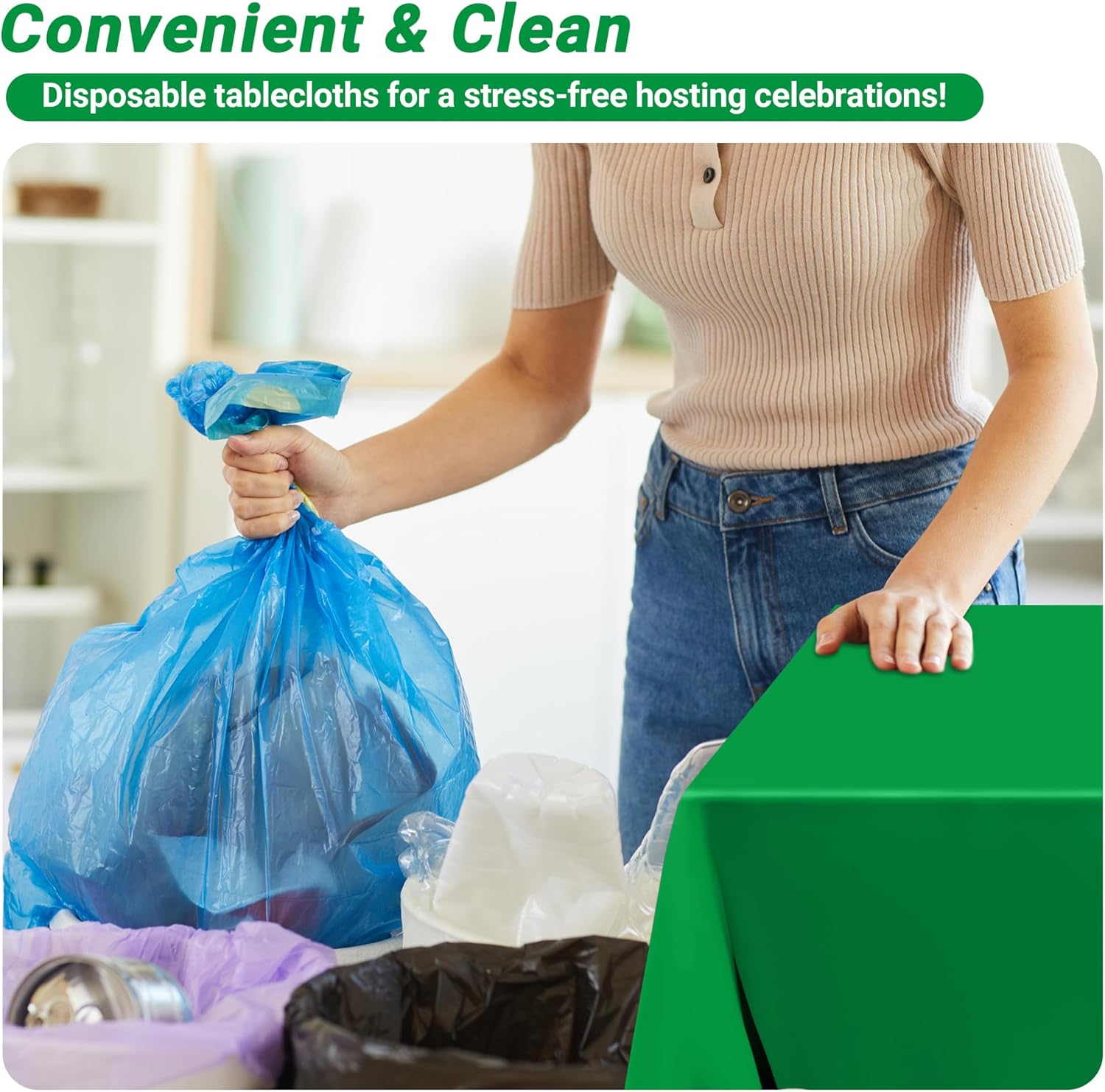- Convenient Experience: Our Plastic Tablecloth Green-4pcs offers a hassle-free solution for all your events. With these disposable tablecloths, you can easily maintain a tidy space while enjoying celebrations like gender reveal parties, baptisms, and graduations.