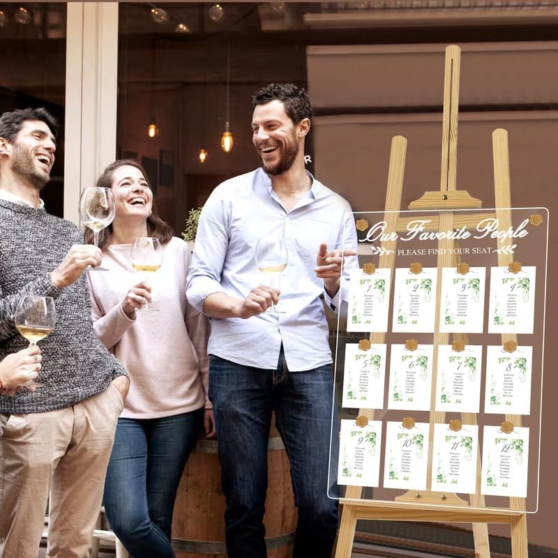 - Usage: ① Use with seat cards (not included) displayed on easels or tables; ② Hang on a sign display stand via the pre-drilled holes for enhanced visibility. If holes are undesirable, cover them with included eucalyptus sealant stickers or decorate with floral arrangements