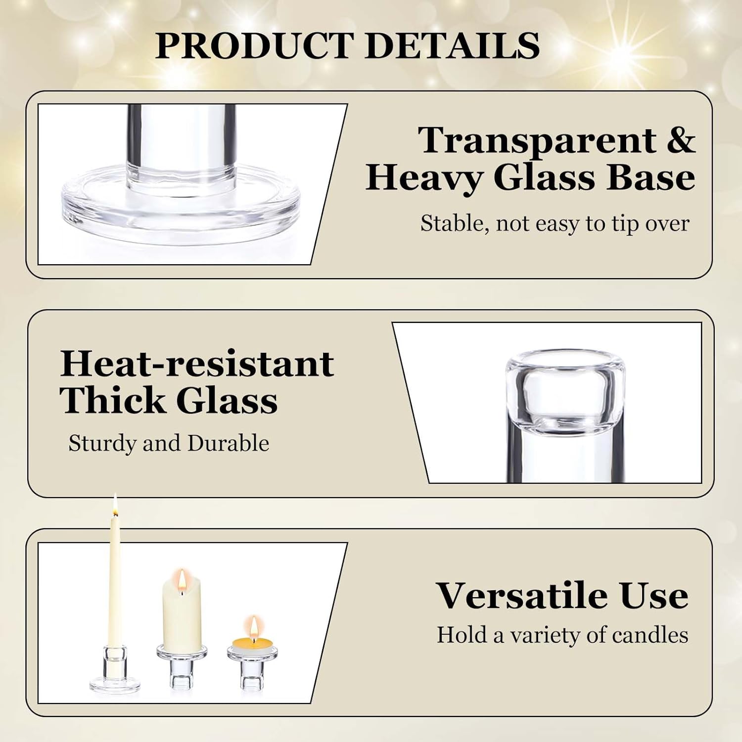 - 【Multi-Candle Compatibility】Designed for 0.87" taper candles, these glass candlestick holders also secure tea lights, votives, and 2" pillar candles. Perfect for Christmas, birthdays, or romantic dinners.