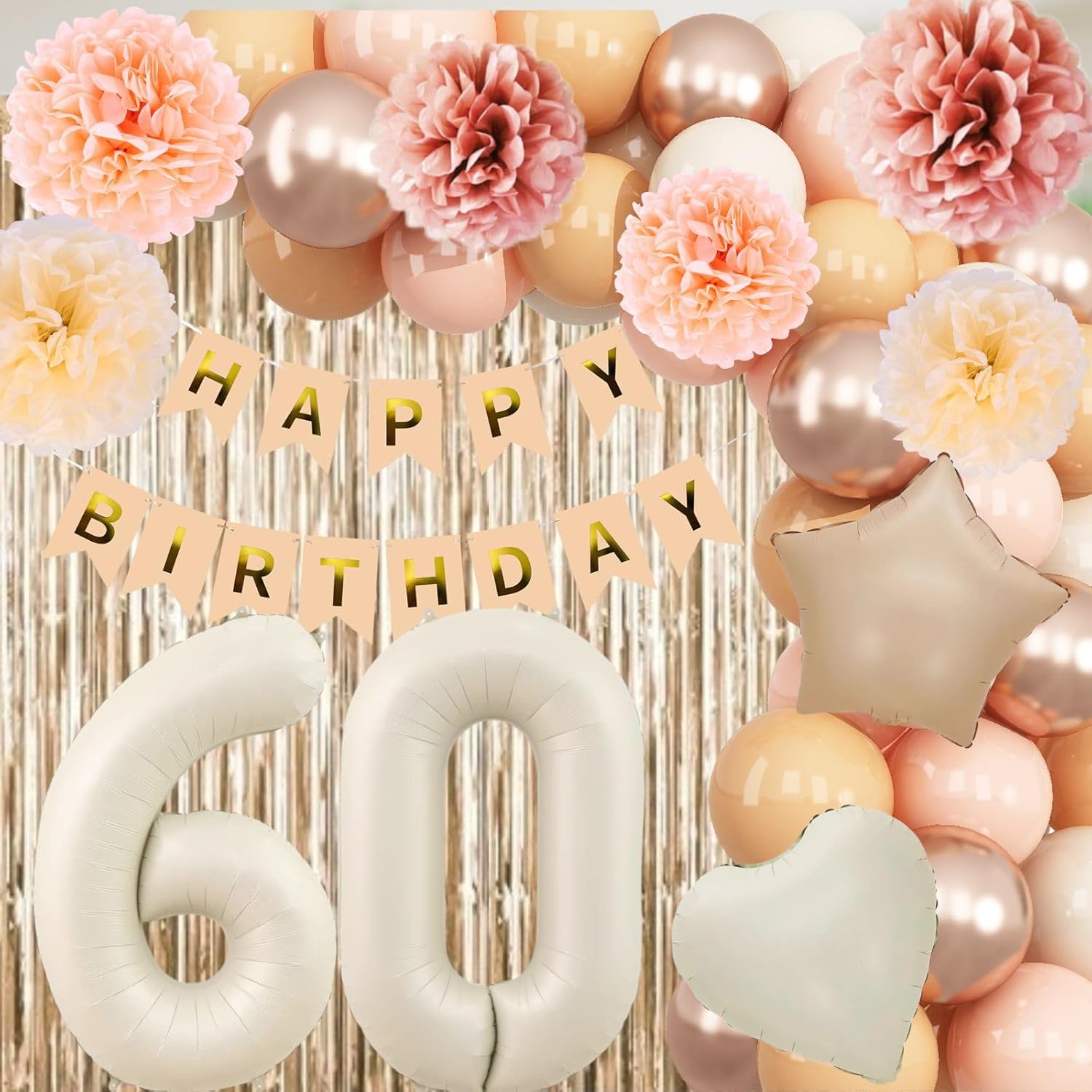 - PACKAGE INCLUDES: 1pc beige 60 number balloon, 1pc happy birthday banner, 2pcs dusty pink paper pom poms, 2pcs blush paper pom poms, 2pcs nude paper pom poms, 1pc champagne gold fringe curtain, 1pc caramel star foil balloons, 1pc cream heart foil balloons, 8pcs nude balloons, 6pcs blush balloons, 8pcs beige balloons, 4pcs champagne gold balloons, 1pc ribbon