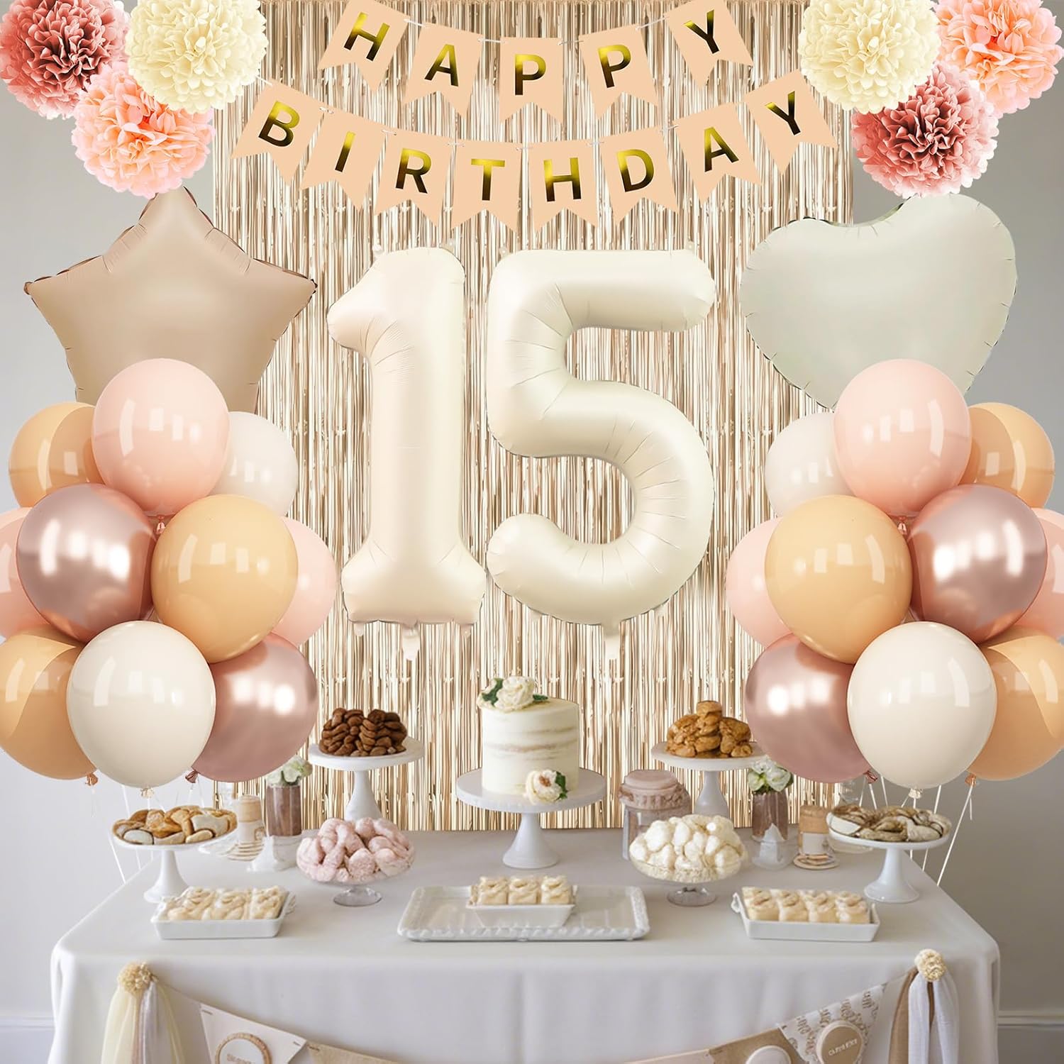 - BEIGE CREAM BIRTHDAY DECORATIONS: Features a soft and stylish color palette of nude, blush, beige, caramel, and champagne gold, great for creating a warm, minimalist birthday setup with a modern, boho vibe, celebrate 15th birthday in style with the included beige “15” number foil balloon