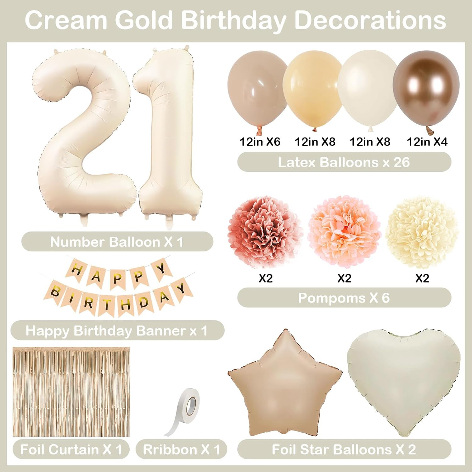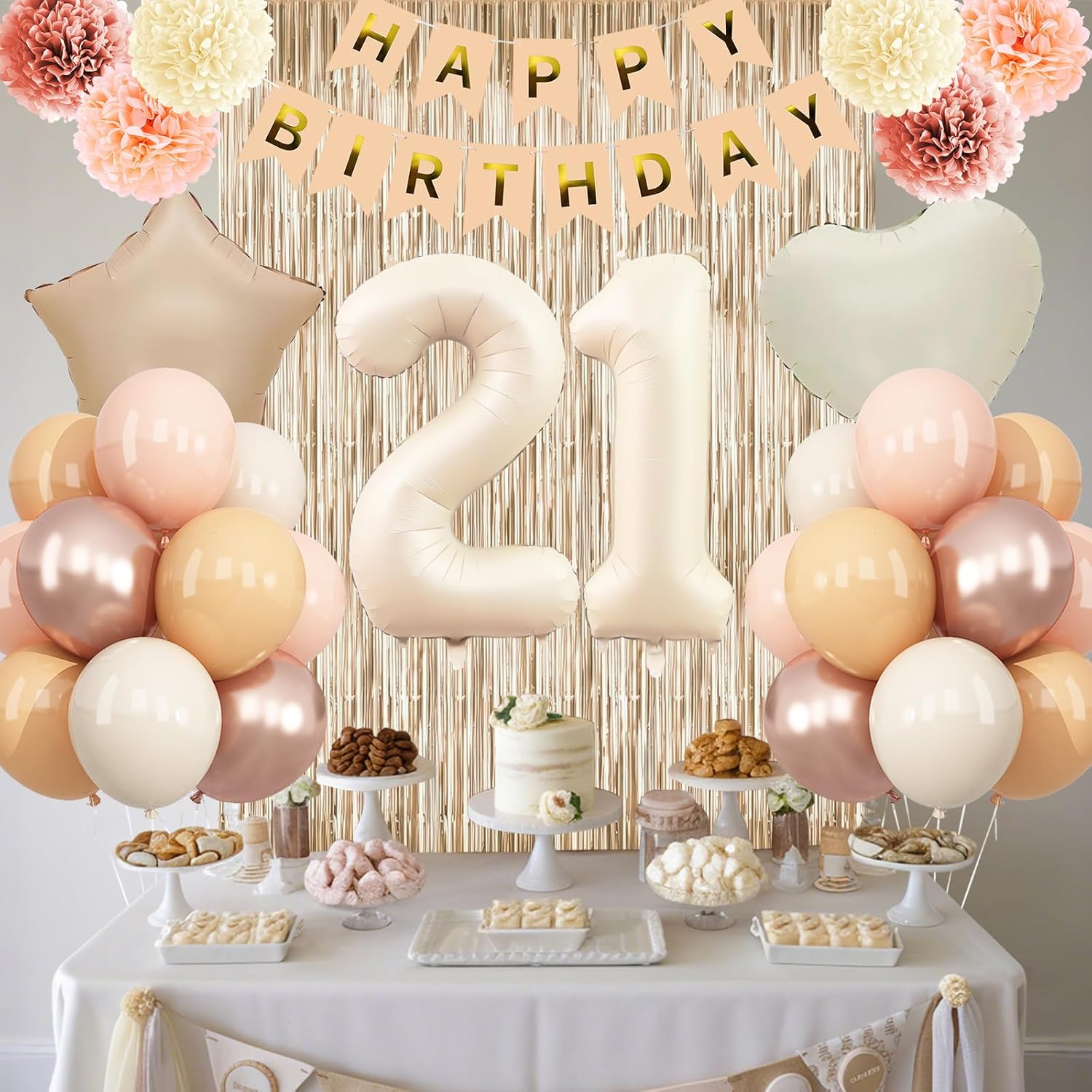 - PACKAGE INCLUDES: 1pc beige 21 number balloon, 1pc happy birthday banner, 2pcs dusty pink paper pom poms, 2pcs blush paper pom poms, 2pcs nude paper pom poms, 1pc champagne gold fringe curtain, 1pc caramel star foil balloons, 1pc cream heart foil balloons, 8pcs nude balloons, 6pcs blush balloons, 8pcs beige balloons, 4pcs champagne gold balloons, 1pc ribbon