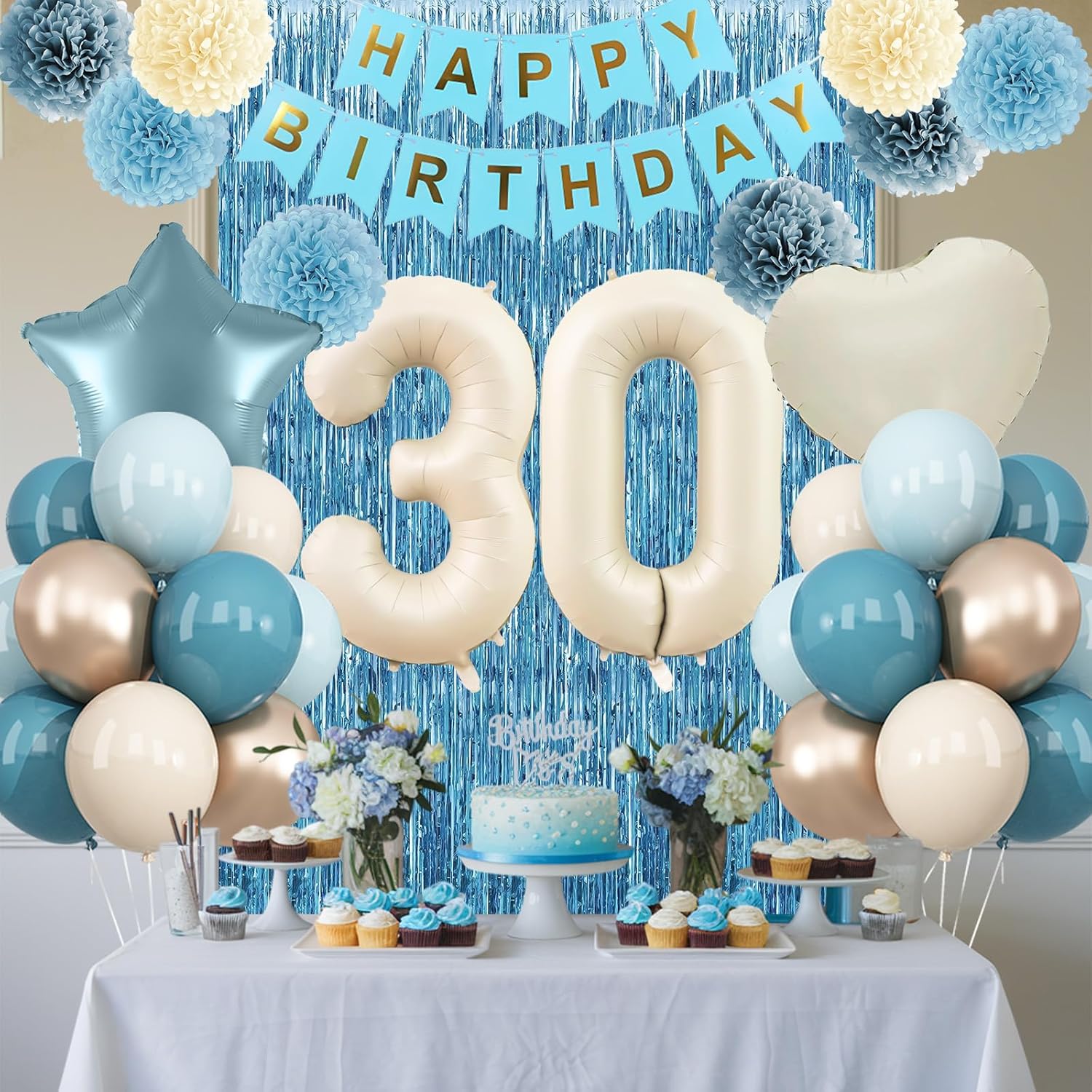 - PACKAGE INCLUDES: 1pc 30 number balloon, 1pc happy birthday banner, 3pcs light blue paper Pom Poms, 3pcs dusty blue paper pom poms, 3pcs nude paper pom poms, 1pc blue fringe curtain, 2pcs dusty blue star foil balloons, 8pcs dusty blue balloons, 7pcs fog blue balloons, 7pcs beige balloons, 4pcs champagne gold balloons, 1pc ribbon