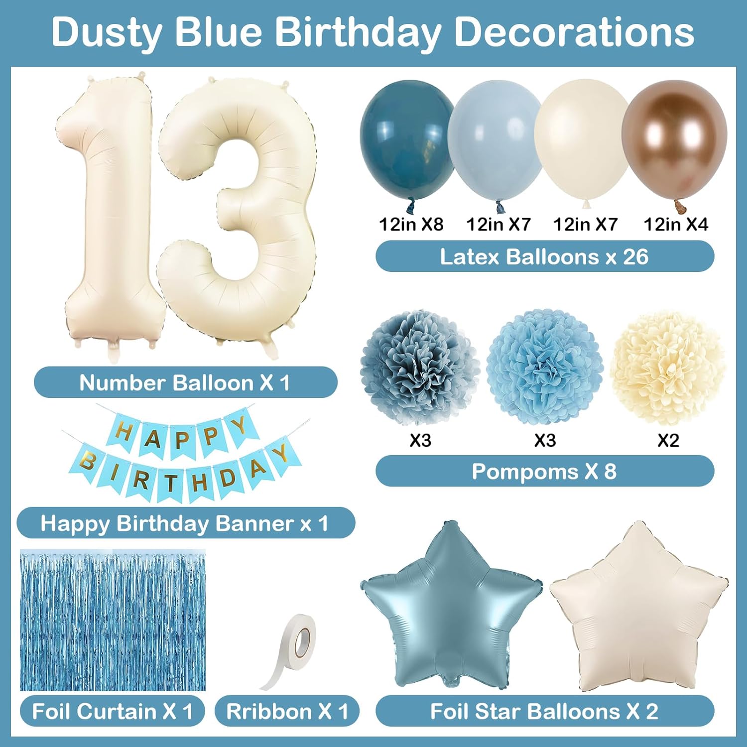 - PACKAGE INCLUDES: 1pc 13 number balloon, 1pc happy birthday banner, 3pcs light blue paper Pom Poms, 3pcs dusty blue paper pom poms, 3pcs nude paper pom poms, 1pc blue fringe curtain, 2pcs dusty blue star foil balloons, 8pcs dusty blue balloons, 7pcs fog blue balloons, 7pcs beige balloons, 4pcs champagne gold balloons, 1pc ribbon