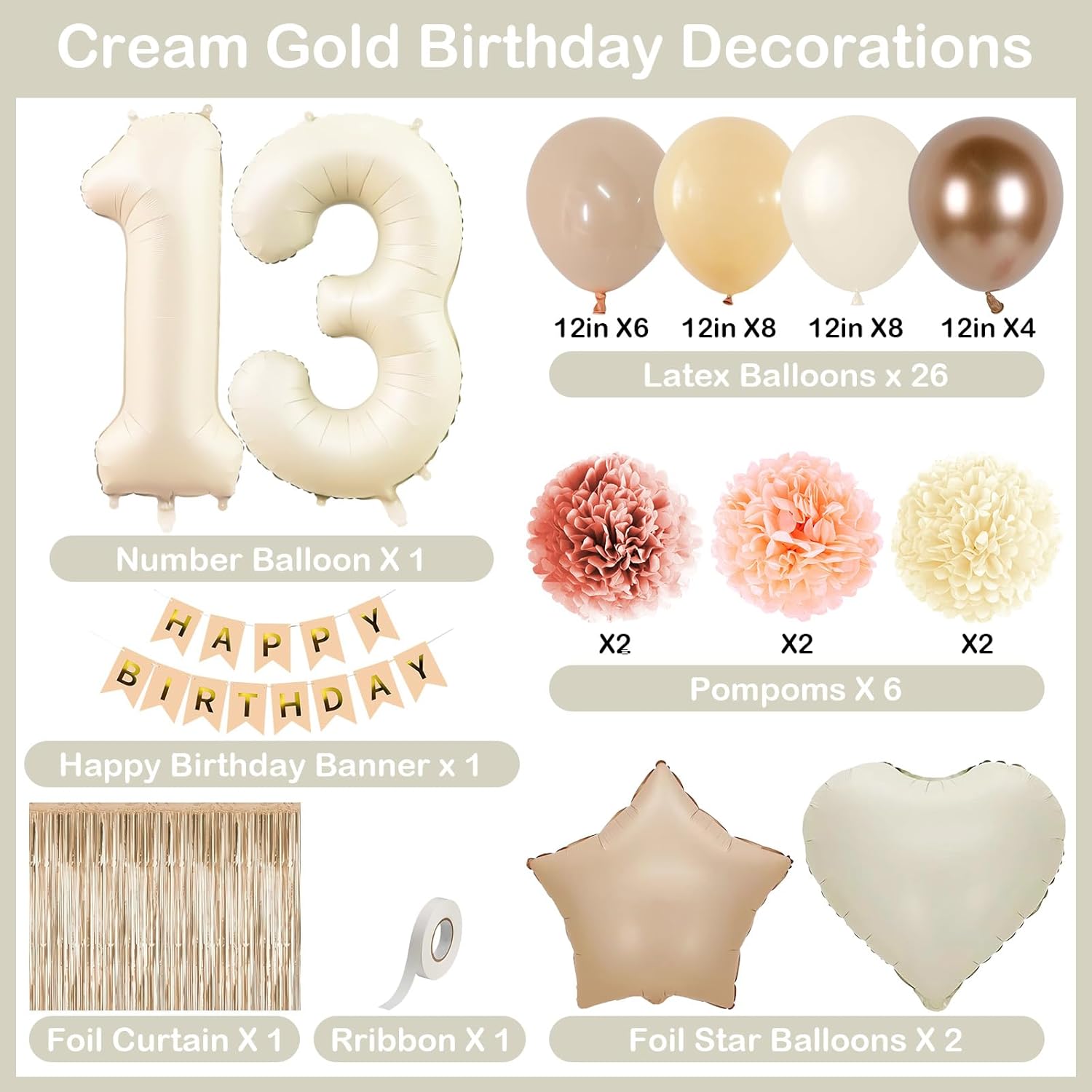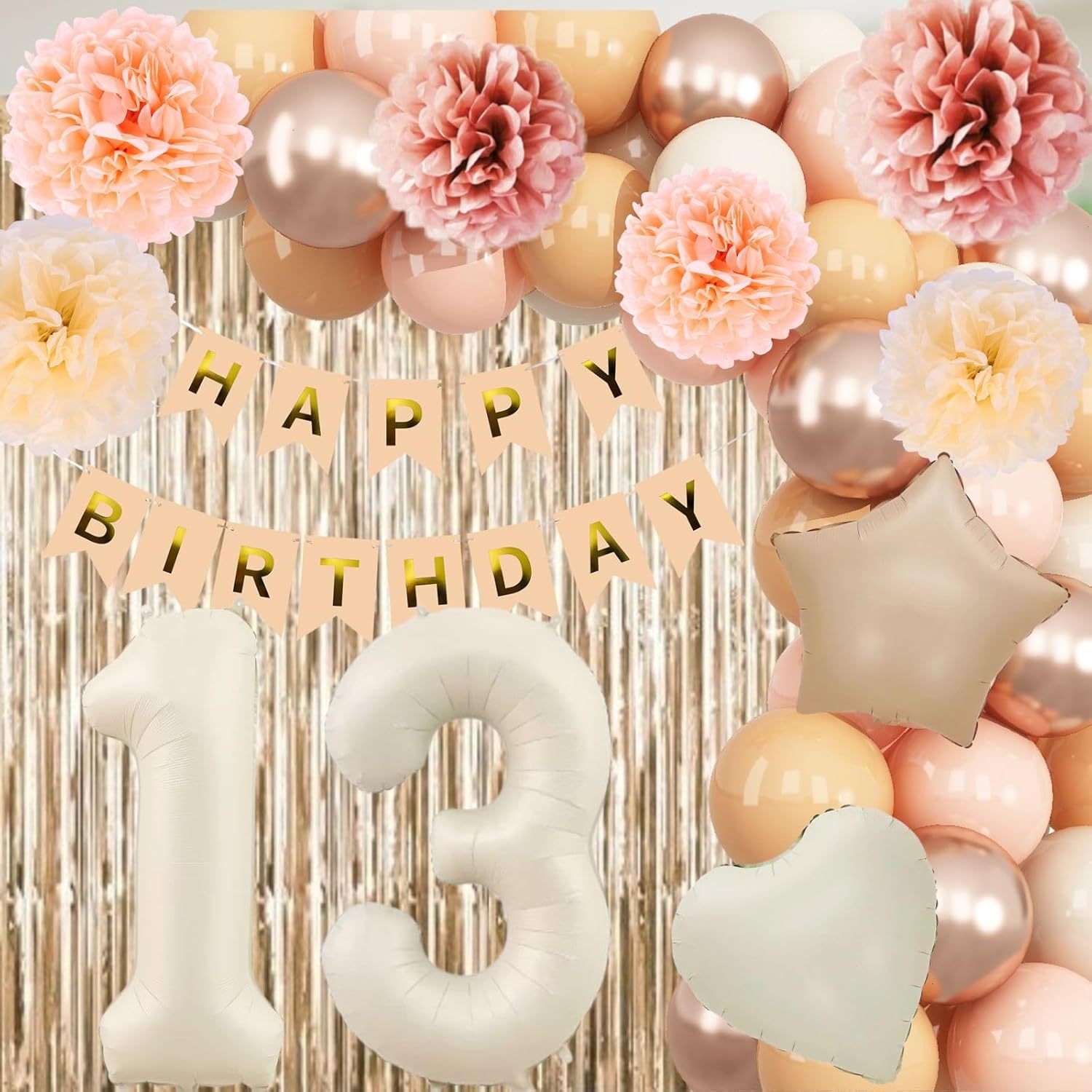 - PACKAGE INCLUDES: 1pc beige 13 number balloon, 1pc happy birthday banner, 2pcs dusty pink paper pom poms, 2pcs blush paper pom poms, 2pcs nude paper pom poms, 1pc champagne gold fringe curtain, 1pc caramel star foil balloons, 1pc cream heart foil balloons, 8pcs nude balloons, 6pcs blush balloons, 8pcs beige balloons, 4pcs champagne gold balloons, 1pc ribbon
