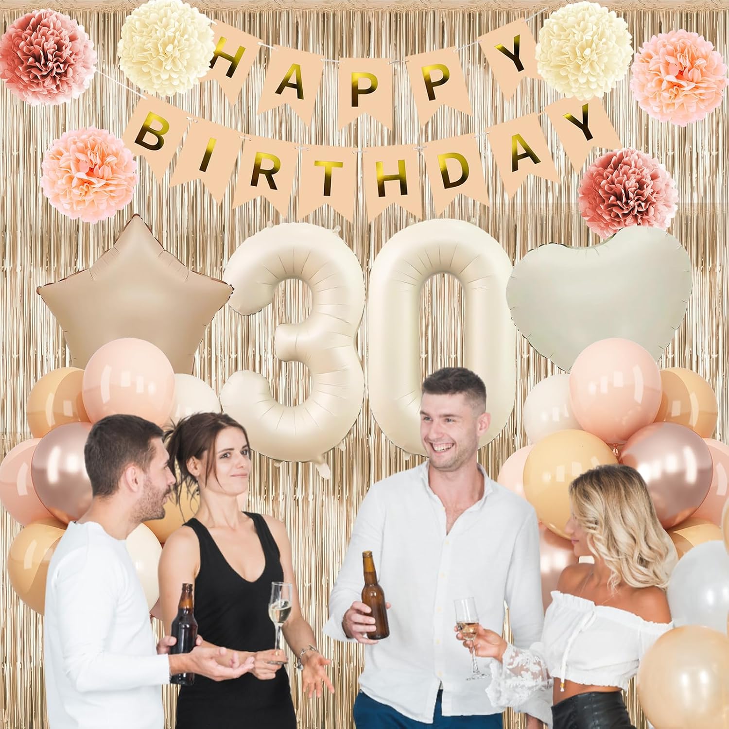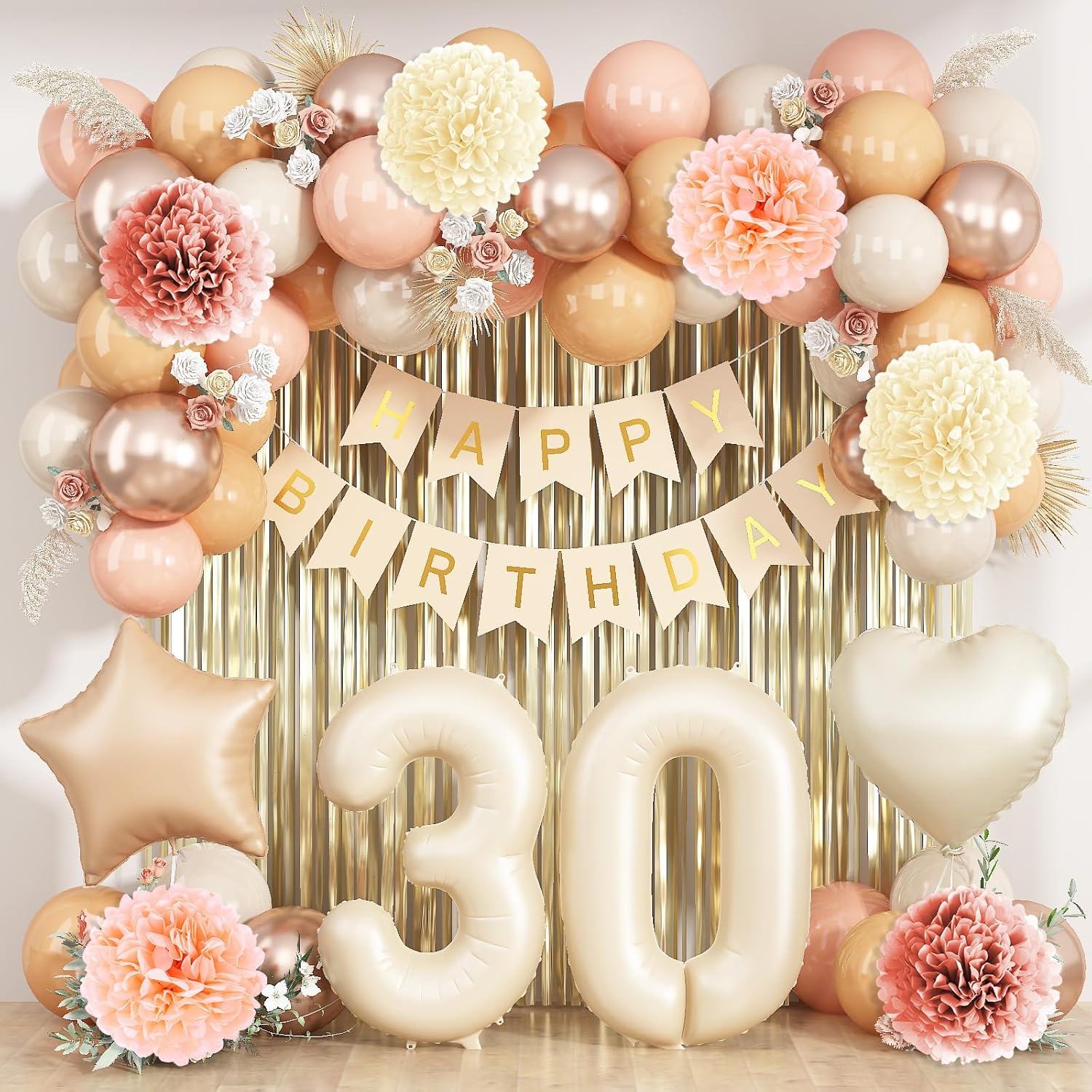- PACKAGE INCLUDES: 1pc beige 30 number balloon, 1pc happy birthday banner, 2pcs dusty pink paper pom poms, 2pcs blush paper pom poms, 2pcs nude paper pom poms, 1pc champagne gold fringe curtain, 1pc caramel star foil balloons, 1pc cream heart foil balloons, 8pcs nude balloons, 6pcs blush balloons, 8pcs beige balloons, 4pcs champagne gold balloons, 1pc ribbon