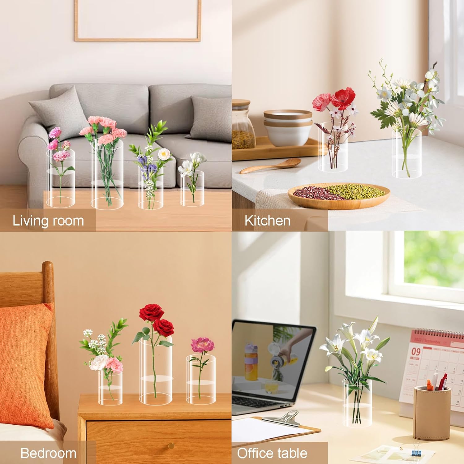 - Wide Application: Our clear acrylic vases are suitable as storage containers for decorating flowers, green plants, succulents, and candlesticks. Placed on tables, kitchens, or dining tables, acrylic vases add a relaxed atmosphere and can bring visual pleasure to people.