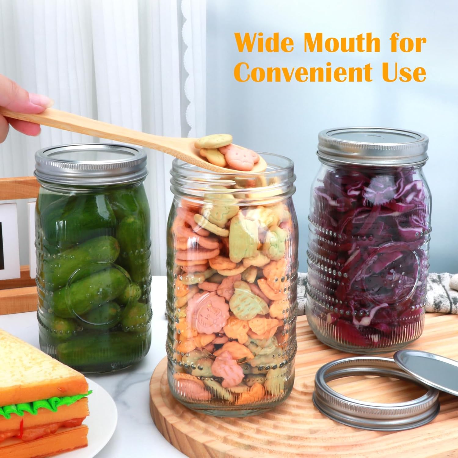 - Premium 32 oz Wide Mouth Mason Jars:Each mason jar is made from high quality thick, BPA-free clear glass that is built to last. With a 32 oz (1 quart) capacity, these large mason jars are perfect for canning, fermenting, and food storage. The wide mouth design (86mm/3.40" diameter) makes filling and cleaning easy, while the 3.55 inches thick glass base and 6.75 inches height offer stability and strength for everyday use
